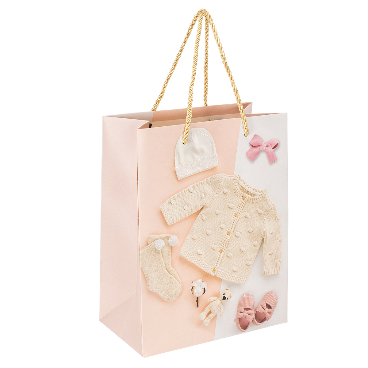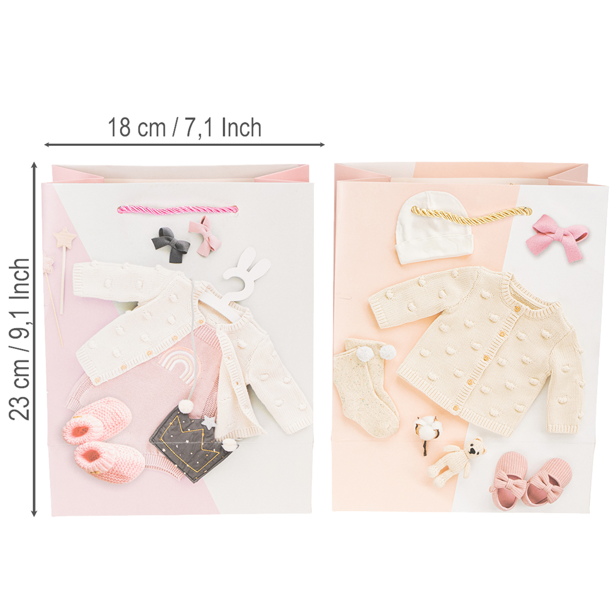 Dovanų maišeliai yra įvairaus dizaino su kardiganais, kūdikių bateliais, buteliukais ir daugybe kitų mielų aksesuarų kūdikiams. Blizgučiai ant popierinių maišelių išryškina detales ir suteikia papildomos magijos jūsų dovanų pakavimui.