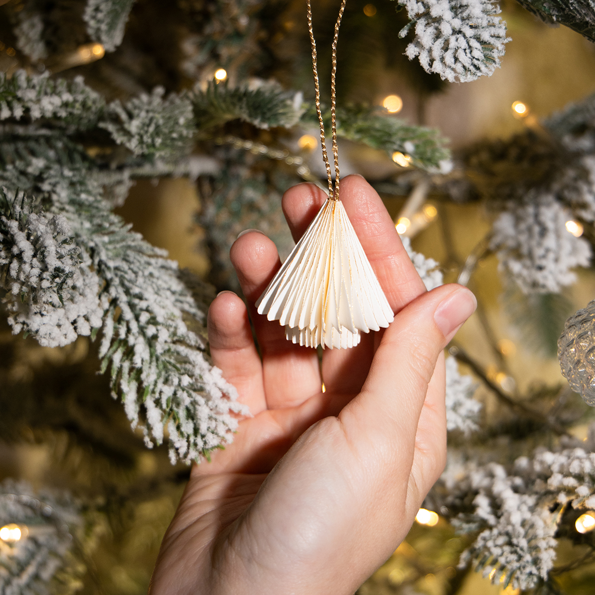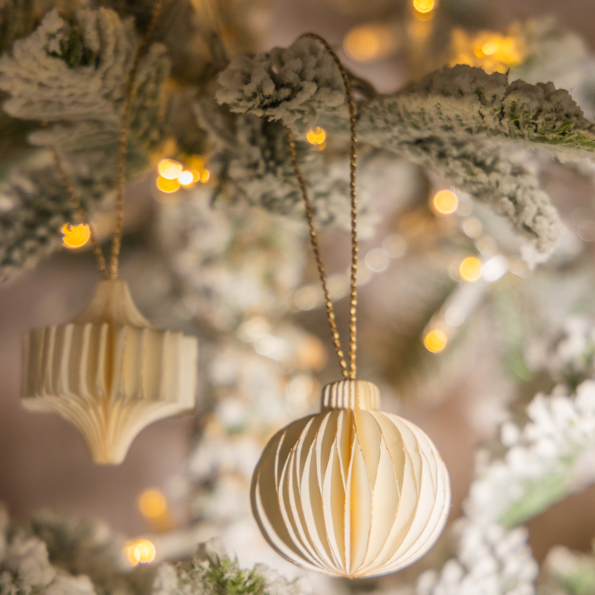 Baltos spalvos popieriniai kalėdinių eglutės papuošalai su auksiniais kraštais – maži ir elegantiški!