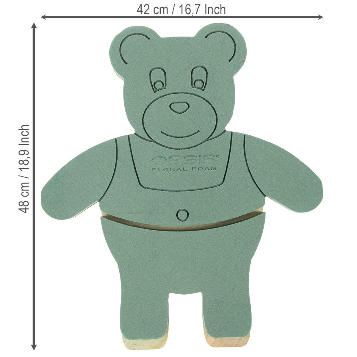 Meškiuko formos Oasis® Steckmoos figūrėlė pristatoma didelėje dėžutėje. Steckmoos Bear yra maždaug 48,5 cm x 42 cm ūgio. Jis yra maždaug 5 centimetrų aukščio.