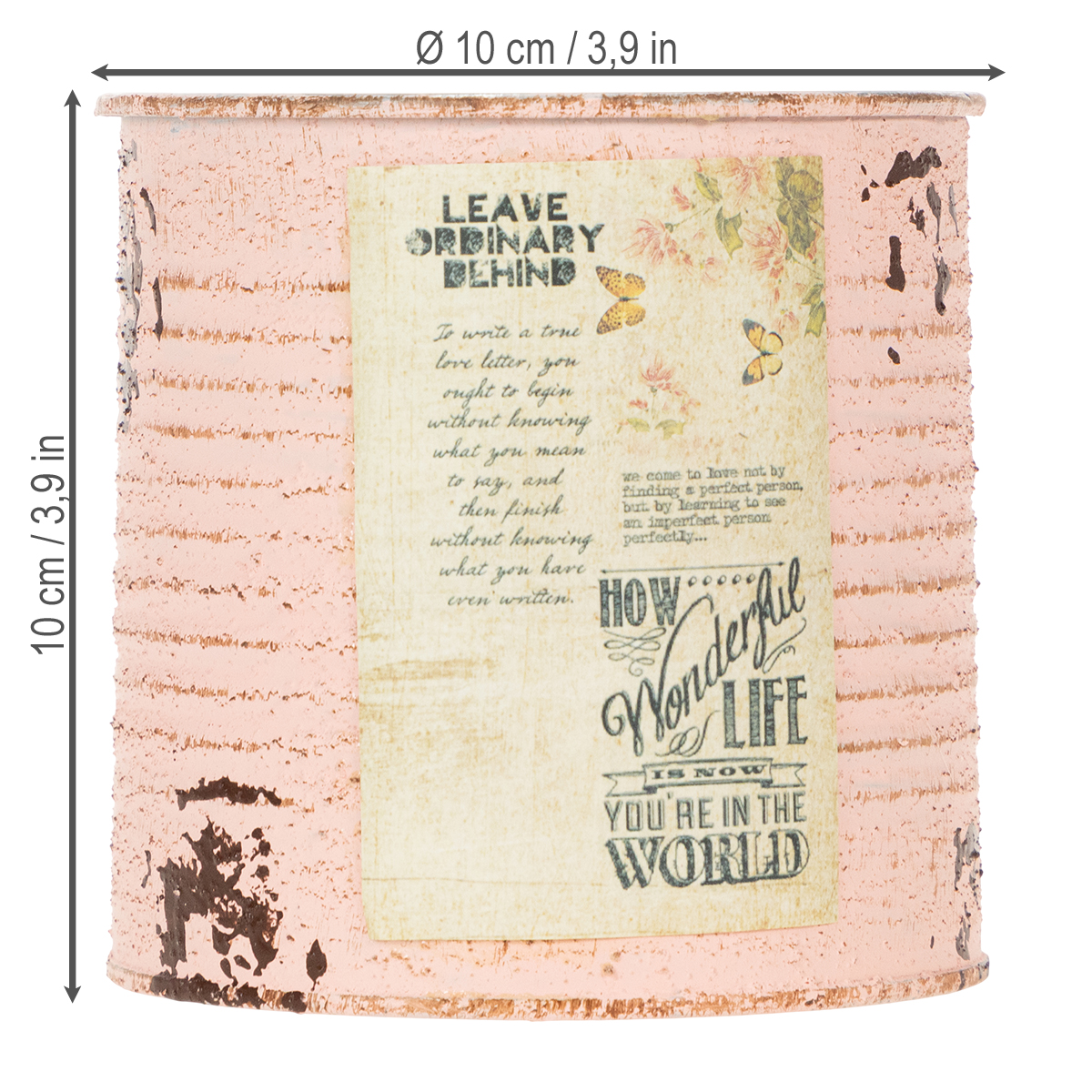 Gėlių vazonas, pagamintas iš dekoratyvinės pastelinės spalvos lašišos skardos, yra bent jau toks pat atmosferinis kaip tikras vintažinis skardinis. Tačiau vasarinė apdaila iš metalo turi lemiamą pranašumą, kad čia nėra aštrių briaunų. Tokiu būdu galite pasodinti skardinę nerizikuodami susižeisti. Rūdžių rudas atspalvis išnyra iš po šepečiu pastelinės spalvos ant skardos griovelių. Be to, dažytos rūdžių dėmės ir nostalgiška etiketė pabrėžia skurdžią retro skardinės prašmatnumą. Dekoratyvinio puodo vidus išlaikomas labai paprastai sidabru.