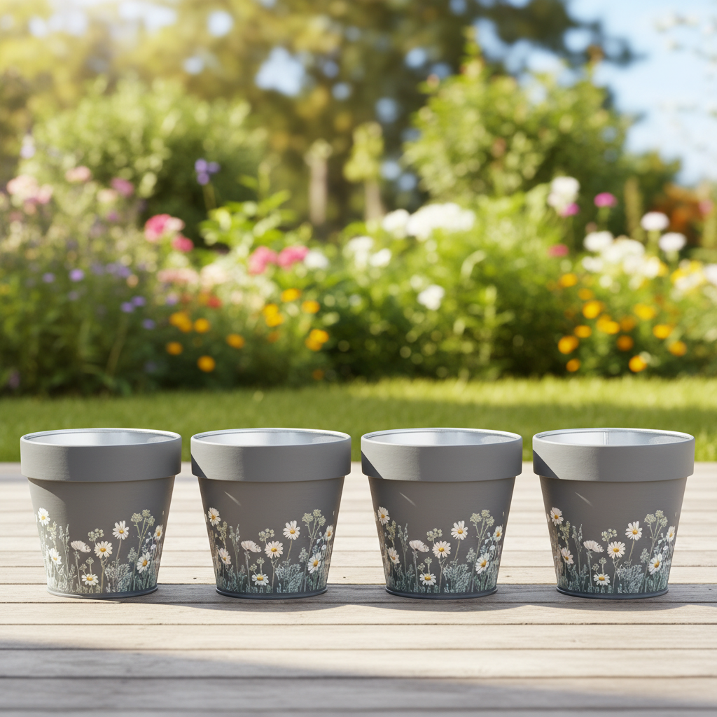 Šis dekoratyvinis gėlių vazonas su ramunių motyvu suteiks jūsų interjerui gaivos. Nesvarbu, ar jis stovi ant palangės, svetainės lentynos ar stalo – subtilus pilkas dizainas harmoningai dera prie bet kokios aplinkos. Žavus gėlių motyvas suteikia bet kokiam kambariui gamtos ir gyvenimo džiaugsmo. Keturi vazonai rinkinyje – tad galite sukurti kelias jaukias oazes. Praktiškas ir lengvas, pagamintas iš tvirto metalo, šis gėlių vazonas yra ne tik gražus, bet ir stebėtinai universalus. Mažas akcentas, derinantis stilių ir funkcionalumą!