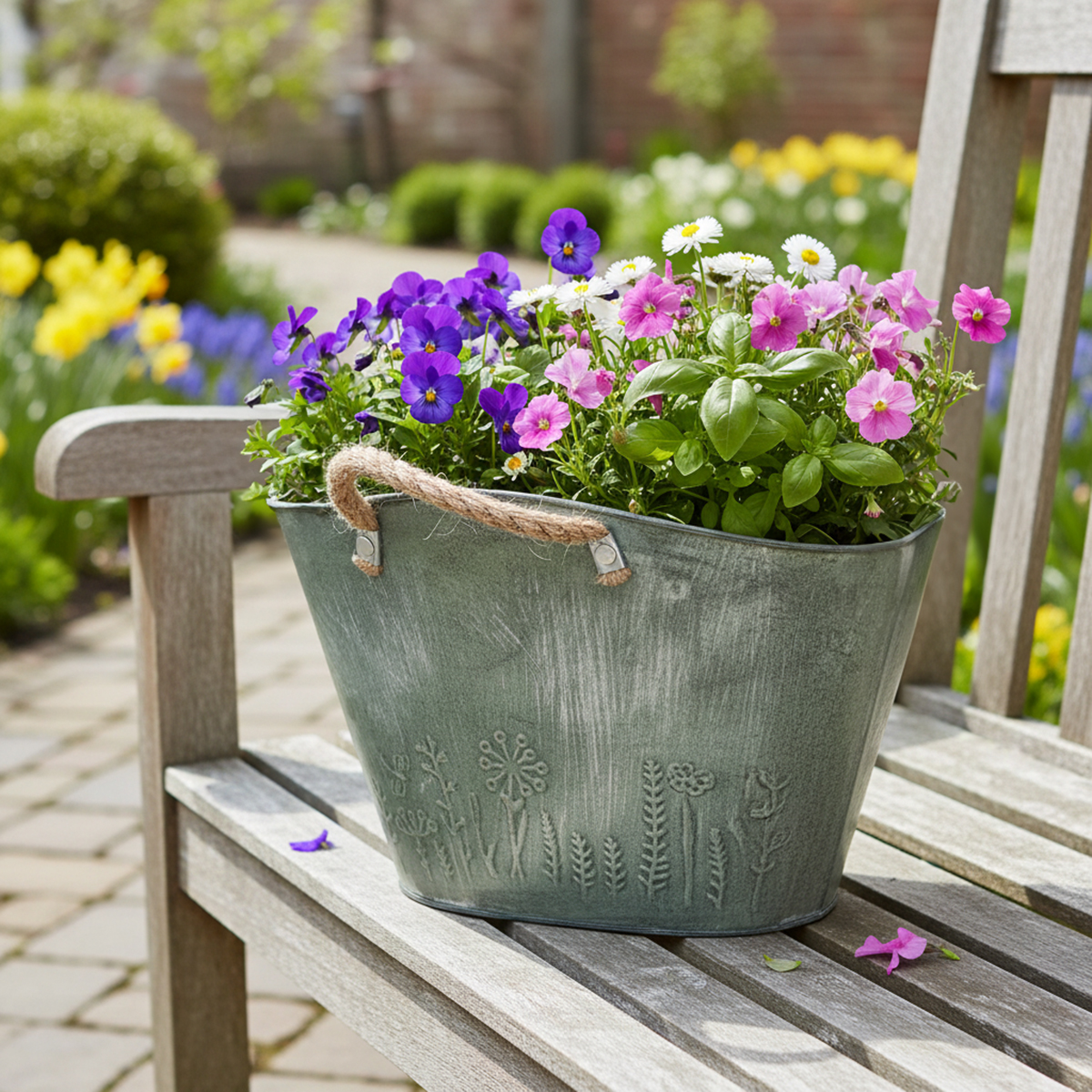 Šis gėlių vazonas su rankenėlėmis laukia jūsų ką tik įsigytų pavasarinių gėlių! Kadangi sėjamoji iš pradžių sukurta kaip maišas iš metalo ir džiuto.