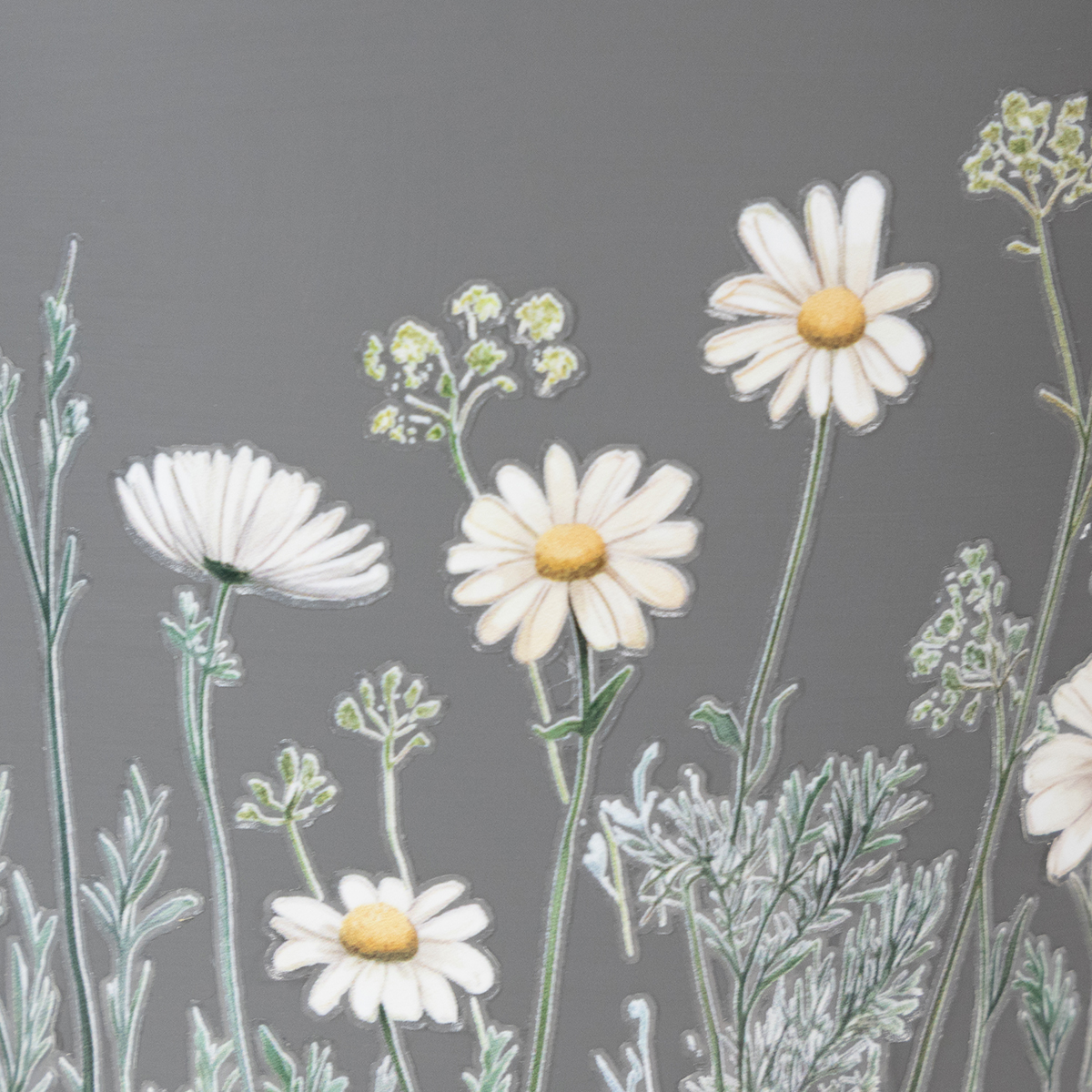 - Dizainas: Subtilūs laukiniai žiedai ant pilko lakuoto metalo