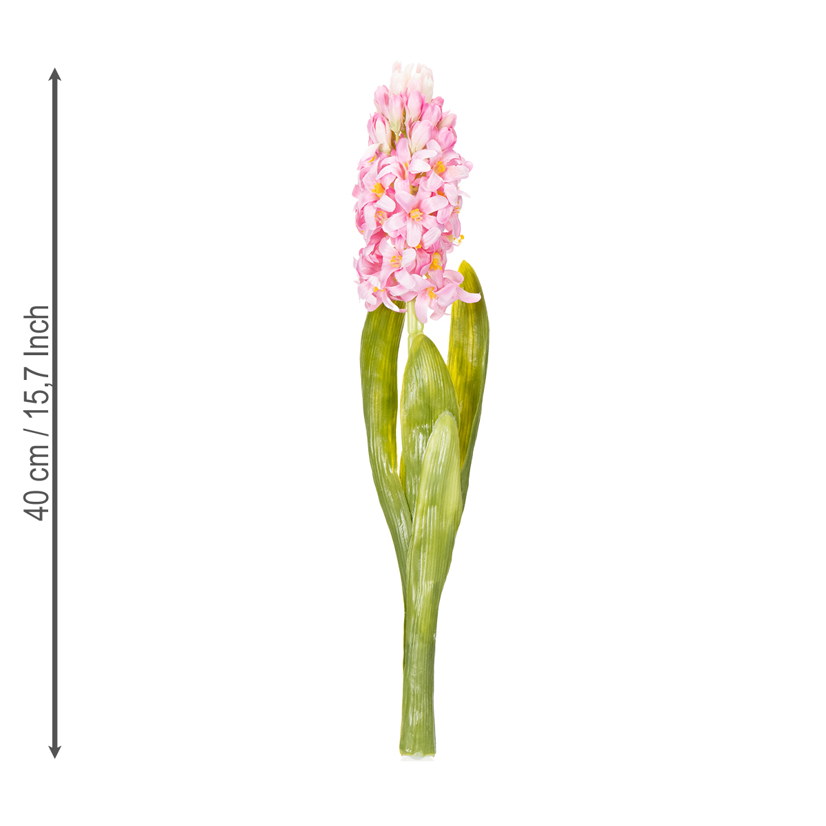 Rožinis hiacintas su tikrojo prisilietimo efektu yra pagamintas iš plastiko, jo bendras aukštis yra apie 40 centimetrų. Gėlės skersmuo yra apie 7 centimetrus.