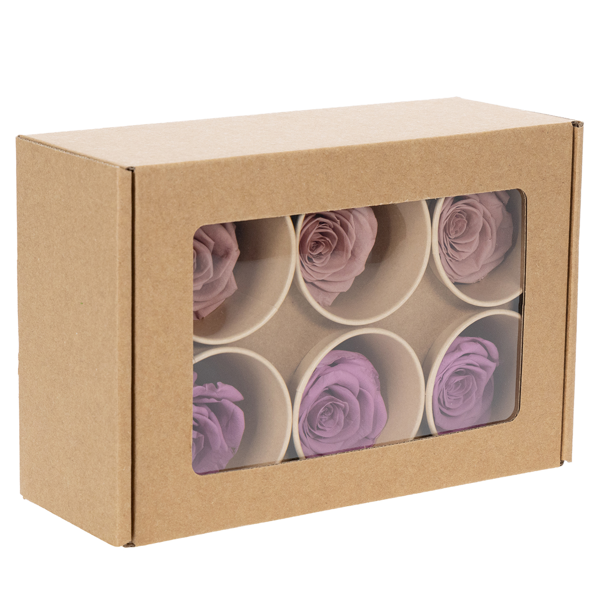 Mūsų elegantiškos alyvinės spalvos konservuotos rožės yra tikros universalios ir puikiai tinka ypatingoms akimirkoms. Gausite šešias gražias rožių galvutes, kurių kiekviena yra 4 cm skersmens ir 5 cm aukščio. Specialus konservavimo procesas užtikrina, kad rožės išlaikytų natūralią formą, spalvą ir grožį be jokios priežiūros. Nereikia laistyti, nereikia vysti – šios rožės sukurtos tarnauti amžinai. Padėkite jas kaip elegantišką pagrindinį papuošalą ant savo vestuvių stalo, naudokite jas kūrybiniams rankdarbių projektams arba padovanokite kaip romantišką jubiliejaus dovaną. Šiltas alyvinis atspalvis spinduliuoja magiška ramybe ir gražiai papildo modernias dekoracijas ar vintažinio stiliaus akcentus.
