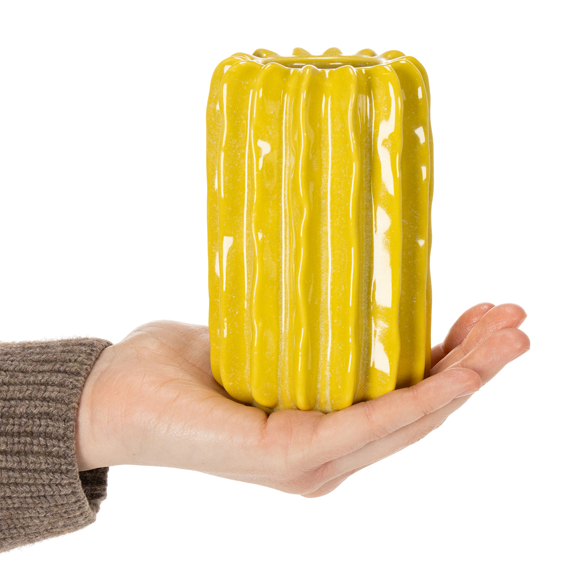 Ar kada susimąstėte, kaip lengvai mažos detalės gali pakeisti kambario atmosferą? Ši keraminė vaza derina modernų dizainą su egzotikos prieskoniu – tobulas bet kurių namų papildymas! Jos griovelių tekstūra primena natūralią kaktuso eleganciją. Subtilus, gelsvas atspalvis skleidžia šilumą ir puikiai dera su įvairiais interjero dizaino stiliais – nuo bohemiško iki minimalistinio. Nesvarbu, ar stovi ant valgomojo stalo, palangės, ar lentynos, ši vaza tikrai pritrauks akį. Derinama su subtiliomis gėlėmis arba naudojama kaip stilingas dekoratyvinis elementas, ji sukuria gaivų ir jaukų atmosferą. Iš pirmo žvilgsnio ji primena saulėtas dienas ir Viduržemio jūros regiono jaukumą.
