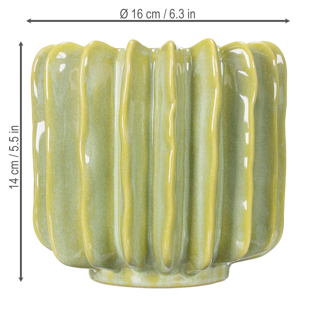 Koks akį traukiantis akcentas! Šis žalias kaktuso vazonas ne tik gražiai atrodo, bet ir suteikia jūsų namams gaivos, egzotiškos dvasios. Nesvarbu, ar esate kaktusų gerbėjas, ar tiesiog mėgstate stilingus namų akcentus, šis dekoratyvinis elementas jus pradžiugins. Harmoninga žalia spalva kartu su unikaliu dizainu ir ryškiais grioveliais suteikia jūsų interjerui ypatingo spindesio. Įsivaizduokite, kaip patraukliai šis 16 cm keraminis vazonas atrodys ant jūsų palangės, svetainės lentynos ar net ant stalo. Jis puikiai derina stilių ir funkcionalumą.