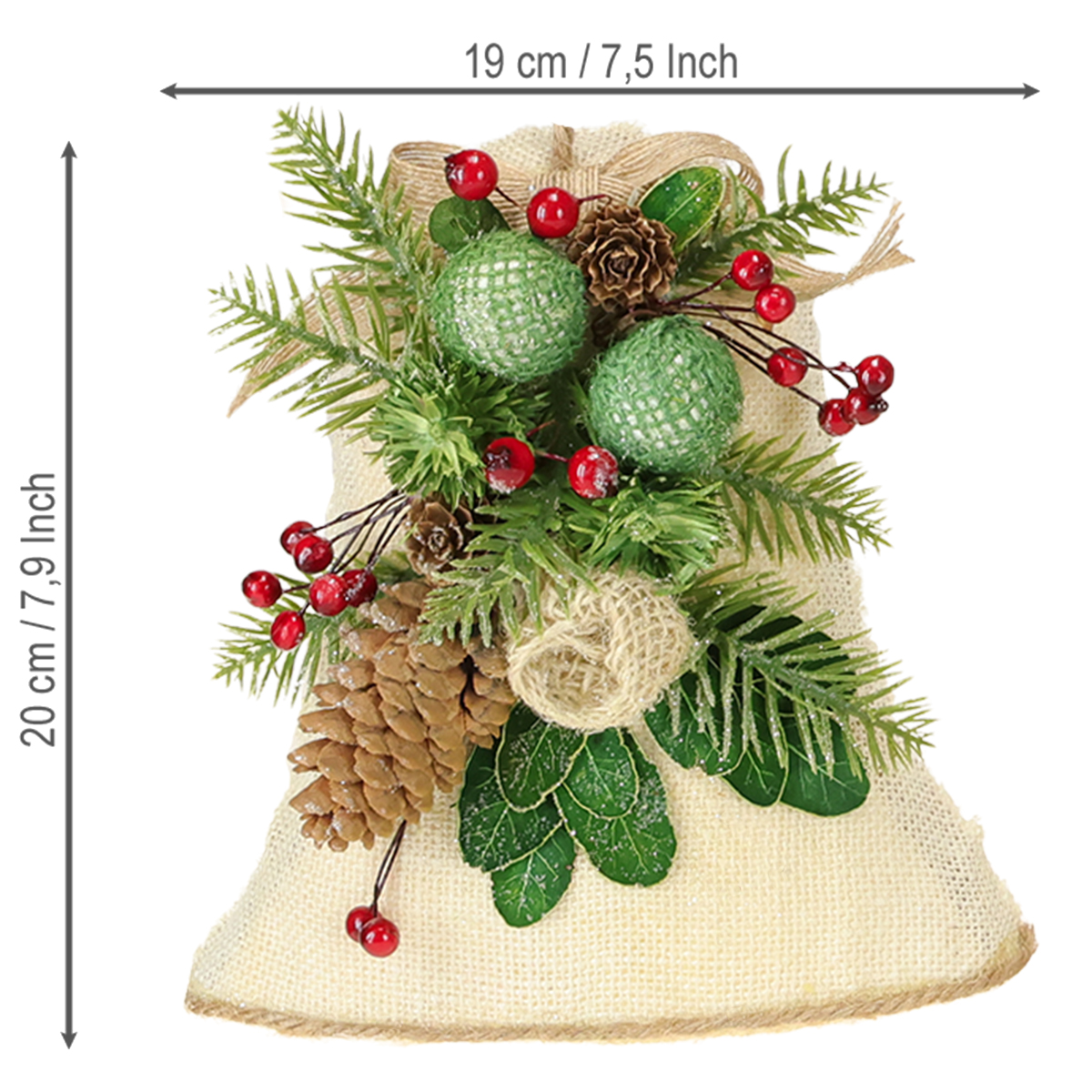 Šie kalėdiniai sienų dekoracijų varpeliai parduodami poromis ir puikiai tinka kaimo stiliaus ar rustikinei aplinkai. Putplasčio polistirenas, apvyniotas šiurkščiai austu kreminiu audiniu su džiuto akcentais, ne tik suteikia lengvumo, bet ir sukuria stulbinantį natūralų vaizdą. Varpeliai yra universalūs – jie gali būti naudojami kaip šventinė pasisveikinimo dekoracija ant svetainės durų arba kaip tradicinė sienų dekoracija, kuri garantuotai pritrauks dėmesį. Dirbtinės kalėdinės šakelės kartu su tikrais kankorėžiais sukuria nuostabiai autentišką vaizdą, o tvirtas džiuto virvelės pakaba užtikrina saugų laikymą. Ar kada nors pagalvojote apie jų sujungimą ir panaudojimą kaip langų dekoraciją?