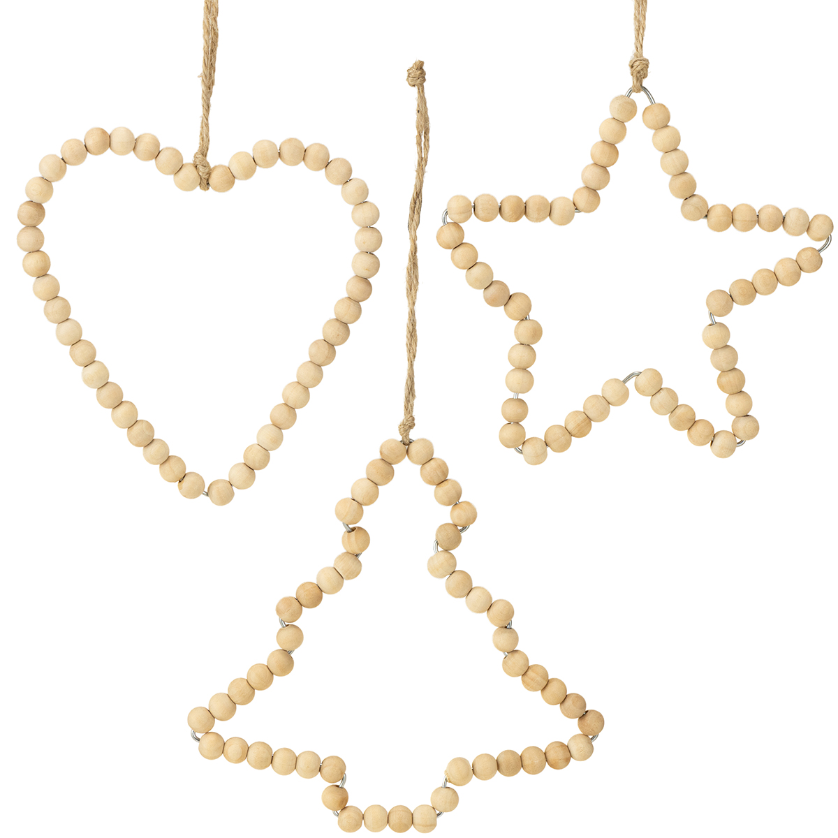 Produkto pavadinimas: Kalėdinės dekoracijos: mediniai karoliukai, širdelė, žvaigždė, eglutė, 13 cm aukščio, 6 dalys
