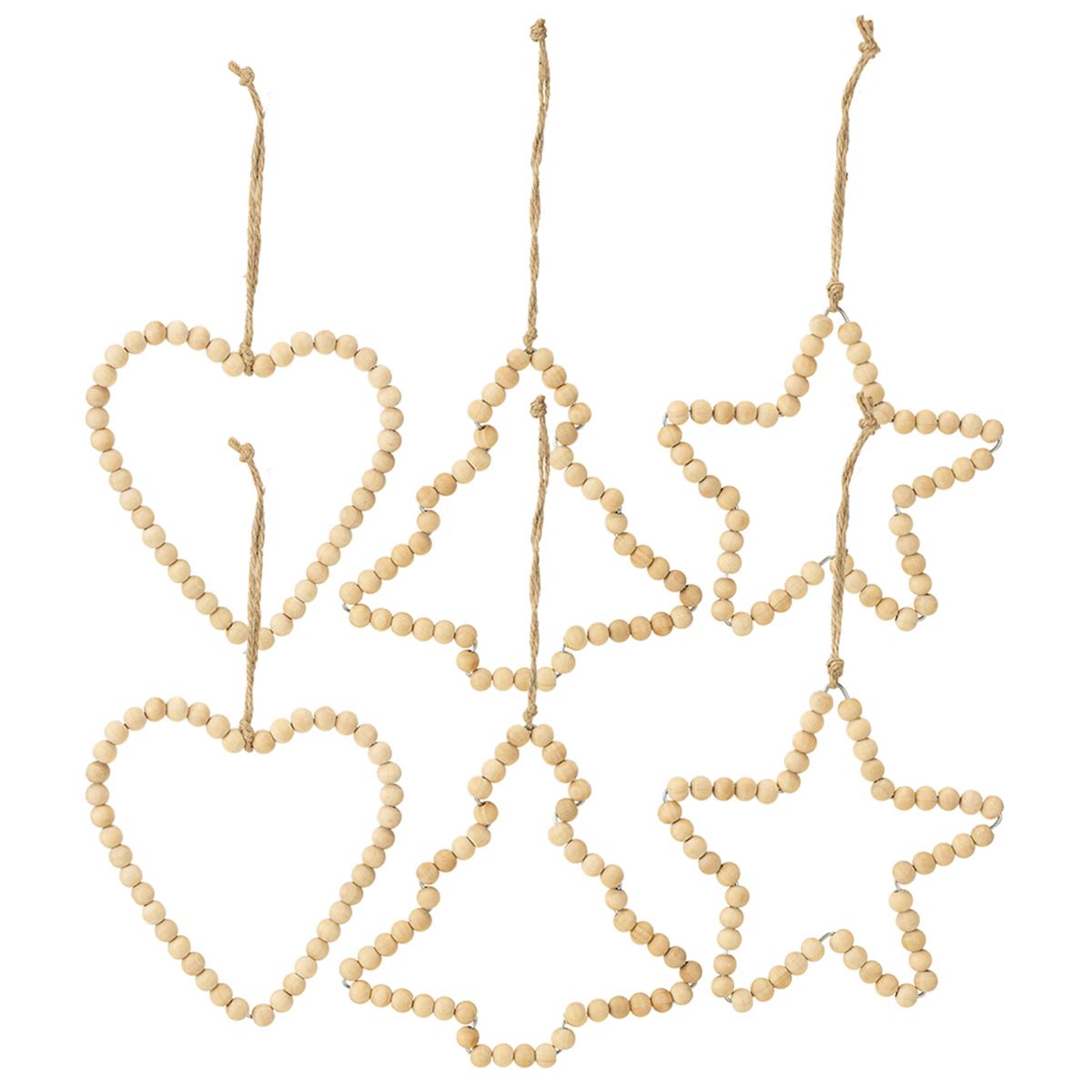 Kalėdinės dekoracijos: mediniai karoliukai, širdelė, žvaigždė, eglutė, 13 cm aukščio, 6 dalys