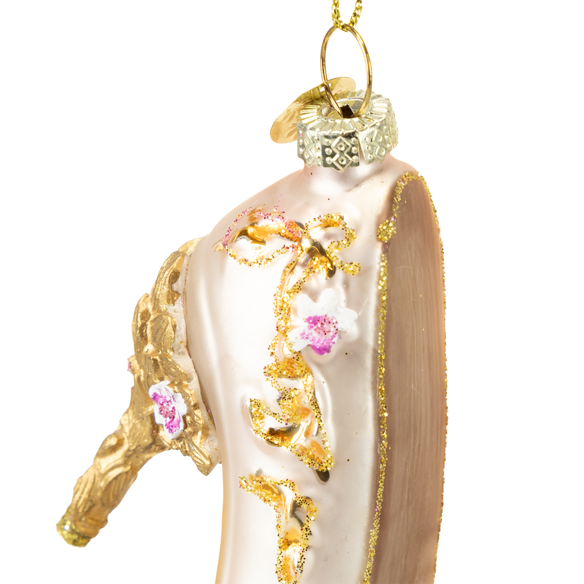 Kiekviena Kalėdų eglutės puošmena turi ypatingą istoriją – ir šios gražios stiklinės avalynėlės nėra išimtis! Jų smulkios detalės, tokios kaip meniškai iškaltos auksinės gėlių dekoracijos, daro jas išties ypatingomis. Pakabinimo kilpa leidžia jas lengvai pritvirtinti prie šakų, girliandų ar net dekoratyvinių šakelių vazoje. Subtilus rožinės spalvos paviršius turi malonų atlasinį atspalvį, kuris kartu su auksu sukuria šventinę ir harmoningą spalvų gamą. Plastikiniai kulnai suteikia avalynei papildomo stabilumo, nesumenkindami elegantiško bendro įspūdžio.
