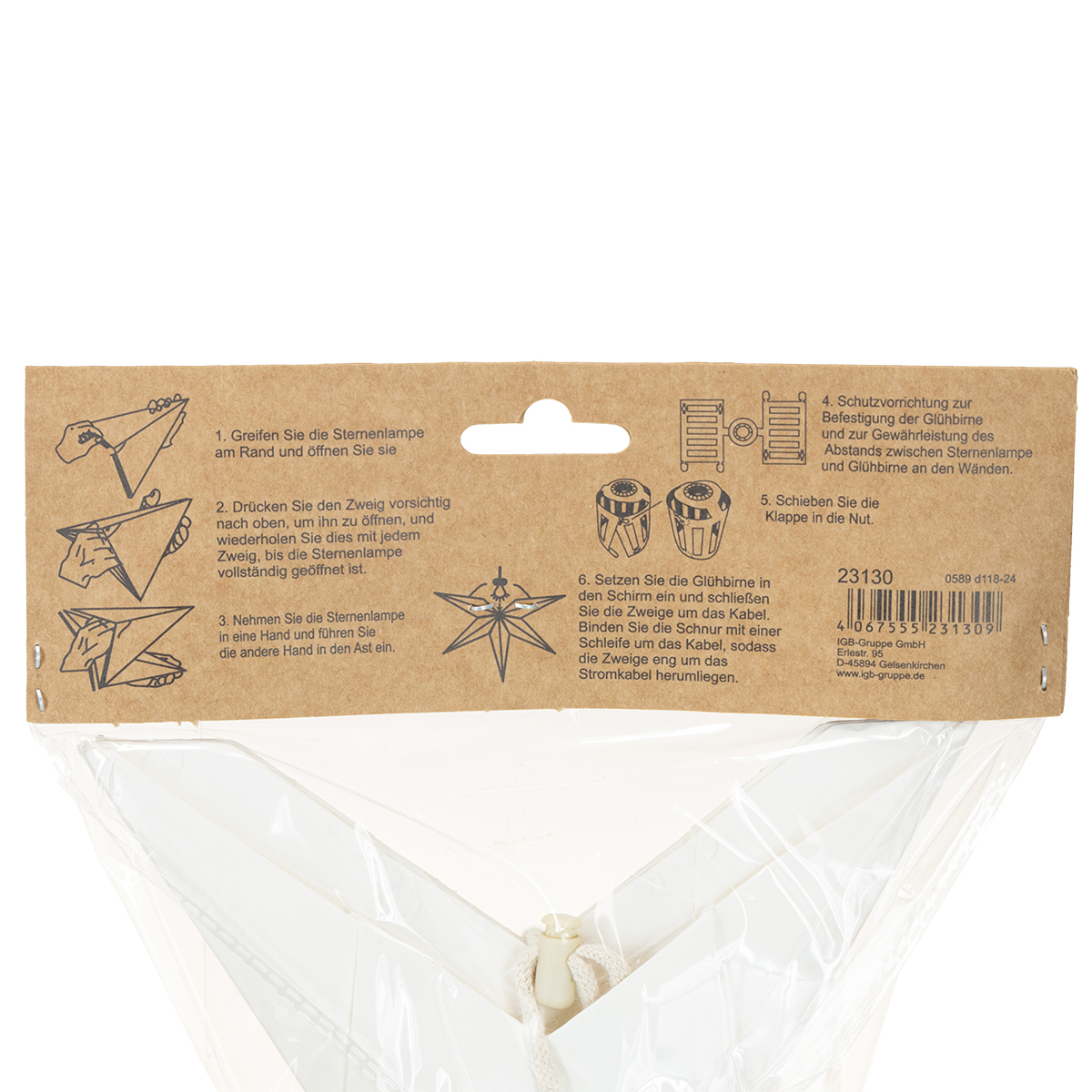 Pagamintos iš tvirto, patvaraus popieriaus, šios dekoratyvinės žvaigždės spinduliuoja natūralumu ir minimalizmu. Priderinta medvilninė virvelė su integruotu virvelės kamščiu yra ir praktiška, ir vizualiai patraukli. Ši gerai suprojektuota pakabinimo sistema leidžia lengvai išdėstyti žvaigždes ir užtikrina tobulą išlygiavimą.