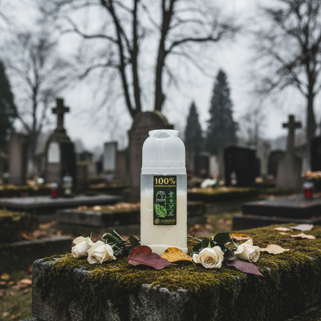 Ypatinga šios kapo žvakės savybė yra permatomas dangtelis, pagamintas iš 100 procentų kompostuojamo plastiko, todėl žvakė yra draugiška aplinkai kiekvieno kapo palydove. ICP antspaudas patvirtina, kad žvakė yra pramoniniu būdu kompostuojama, todėl atitinka jūsų tvaraus gyvenimo troškimą, net kaip suvenyrą.