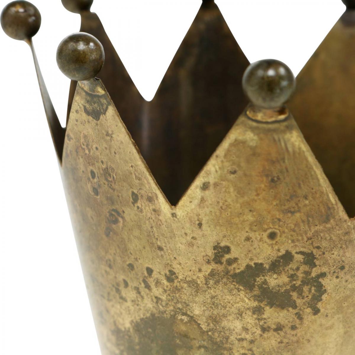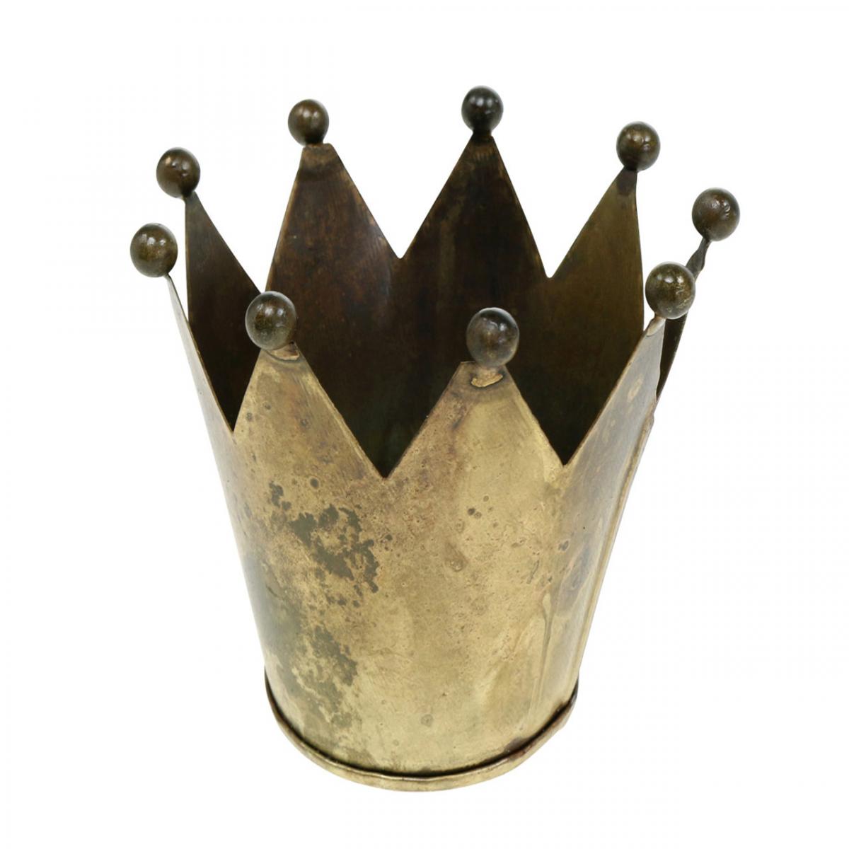 Suteikite savo stalui patrauklų retro įvaizdį su šiuo metaliniu papuošimu! Nuo karališkojo kaimo namų stiliaus iki kalėdinės dekoracijos – savo puošybos idėjas galite žavingai apvainikuoti žvakute arba nedideliu augaliuku metaliniame inde kaip talpykloje. Norėdami naudoti metalinį karūną kaip mažą sodintuvą, turėtumėte naudoti foliją ir drenažą, kad išvengtumėte stovinčios drėgmės. Karūnėlė tinka ne tik kaip arbatinės žvakidės ar žvakidės, bet ir labai kilniai atrodo su nedideliu dirbtiniu žaliu augalu vazonėlyje ar vynmedžio augalu. Arba užpildykite dekoratyvinę karūnėlę gėlių putomis arba putų polistirolu ir sukurkite senovinės išvaizdos džiovinimo kompoziciją - maža karūnėlė, daug galimybių!