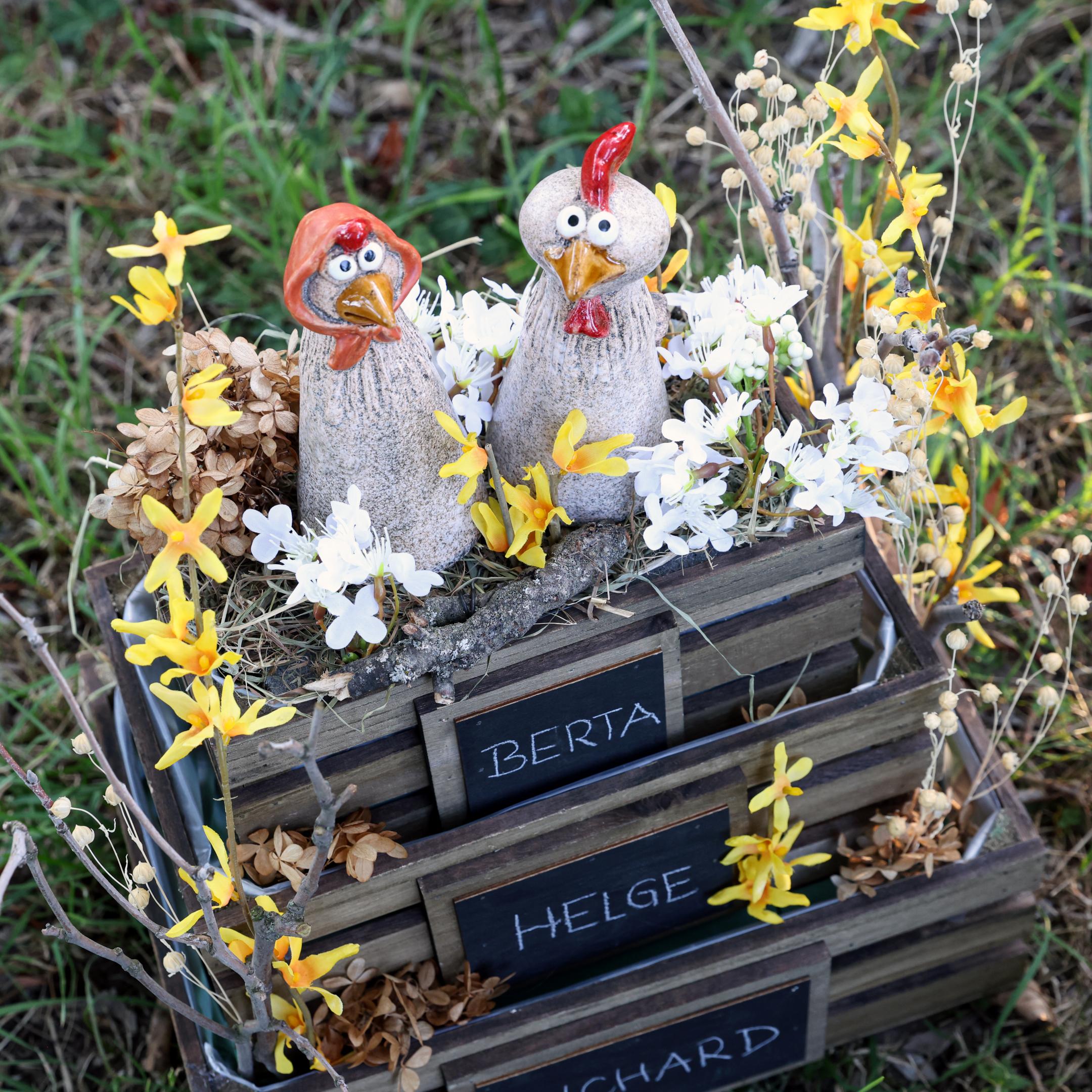 Mūsų keraminiai dekoratyviniai viščiukai puikiai tinka įvairioms dekoravimo koncepcijoms. Padėkite juos ant palangės, kad viduje ir išorėje skleistumėte Velykų nuotaiką. Derinkite rinkinį su mažais spalvingais kiaušiniais arba gėlių kompozicijomis iš dirbtinių Floristik24 gėlių, kad sukurtumėte harmoningą ansamblį. Ypač ant Velykų stalo kartu su mūsų keraminiu zuikučiu iš to paties asortimento jie įneša į kambarį nuotaiką ir gyvybę. Arba nustebinkite savo svečius šia žavia puošmena terasoje per Velykinius priešpiečius. Norėdami sukurti harmoningą bendrą įspūdį, Floristik24 galite rasti kitų daiktų, tokių kaip natūralių atspalvių vazos ar kaimiško stiliaus staltiesės, kurios pabrėžia kaimo namų išvaizdą.