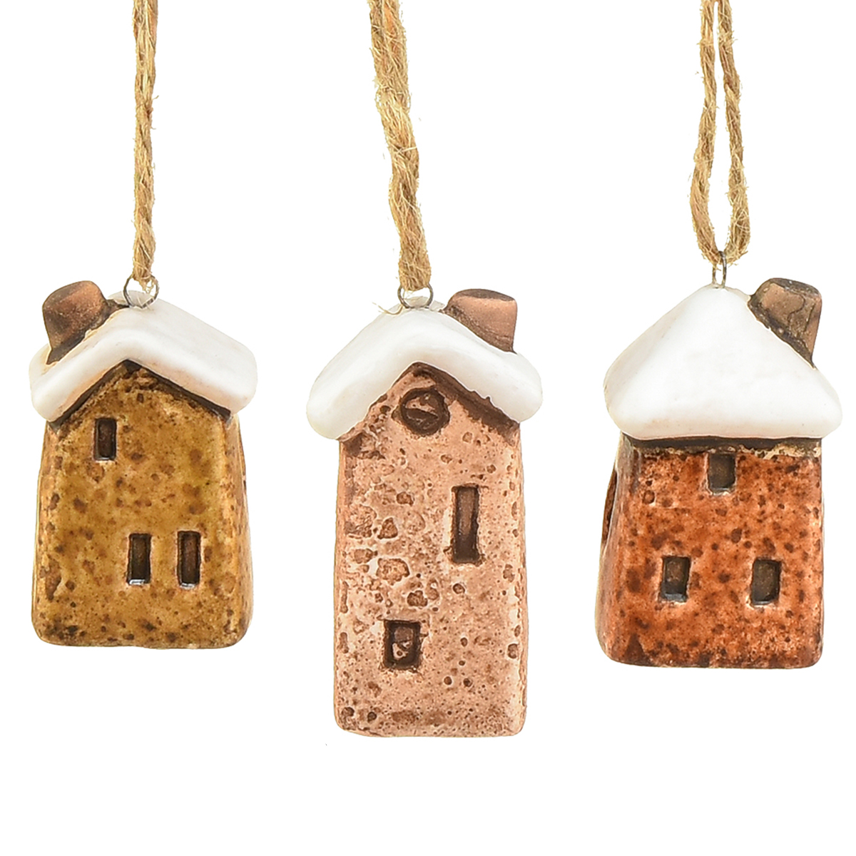 Keramikiniai kabantys nameliai – įvairių rudų atspalvių, sniego dengti stogai – žavinga kalėdinė puošmena – 6 vnt.