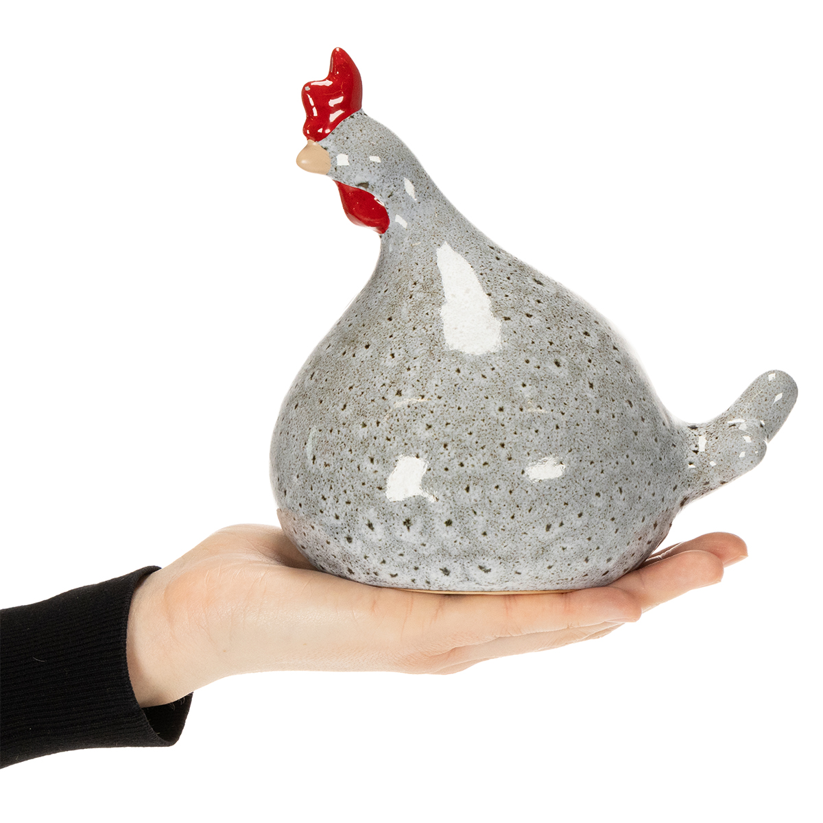 Šios keraminės vištų figūrėlės, kurių aukštis – 16 cm, o plotis – 13 cm, idealiai dera su elegantiškais staliukais, lentynomis ar indauja. Žavinga jų forma kartu su mėlynai dėmėtu paviršiumi suteikia vištoms žaismingo elegancijos. Tie, kurie turi akį detalėms, įvertins išskirtinį snapą ir mažas akis – sėkmingą modernumo ir kaimiško žavesio derinį.