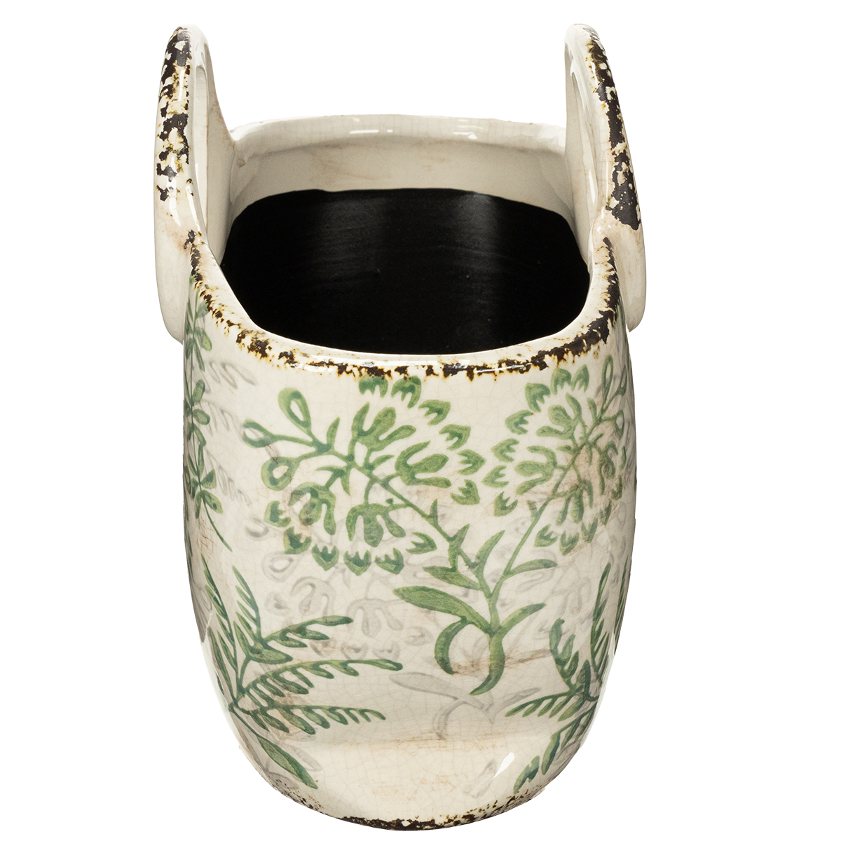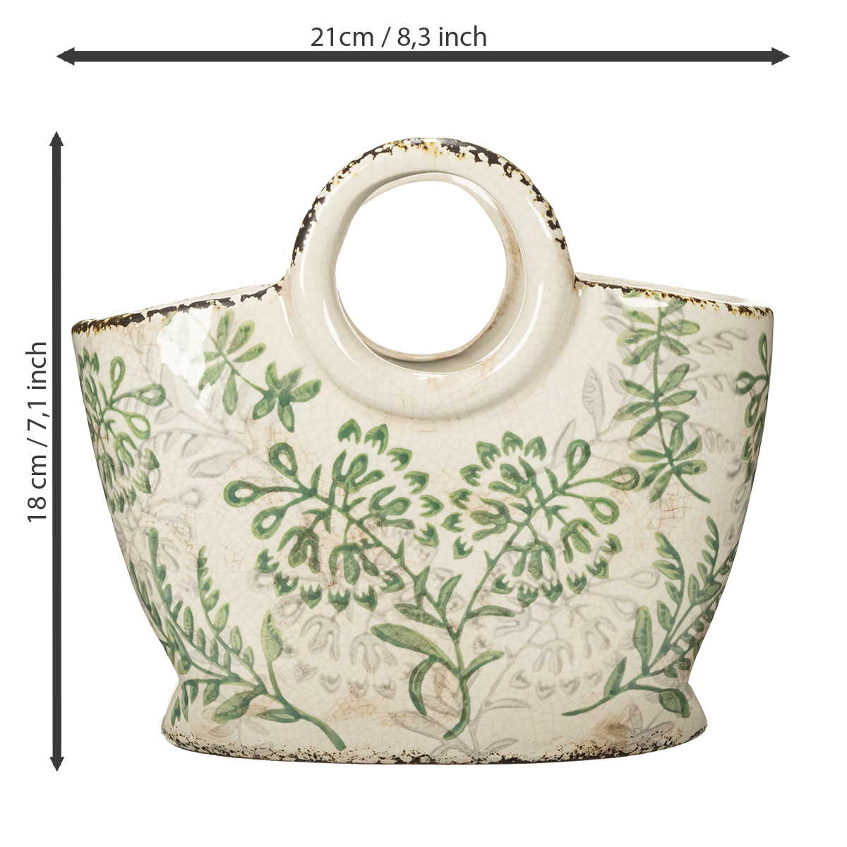 Ieškote vazono, kuris papuoštų jūsų gyvenamąją erdvę ir kartu spinduliuotų vintažiniu žavesiu? Tuomet mūsų keraminis krepšys yra būtent tai, ko jums reikia! Šis žavus krepšys, pagamintas iš rankomis dažytos keramikos, yra ne tik praktiškas indas žolelėms, gėlėms ar dekoracijoms, bet ir tikras akį traukiantis objektas. Žavus žalias ir baltas dizainas kartu su mielu gėlių raštu suteikia bet kokiam kambariui gamtos ir elegancijos prisilietimą. Nesvarbu, ar jis pastatytas balkone, svetainėje ant palangės, ar kaip stalo puošmena – šis krepšys harmoningai dera prie bet kokios aplinkos ir sukuria šiltą bei jaukią atmosferą.