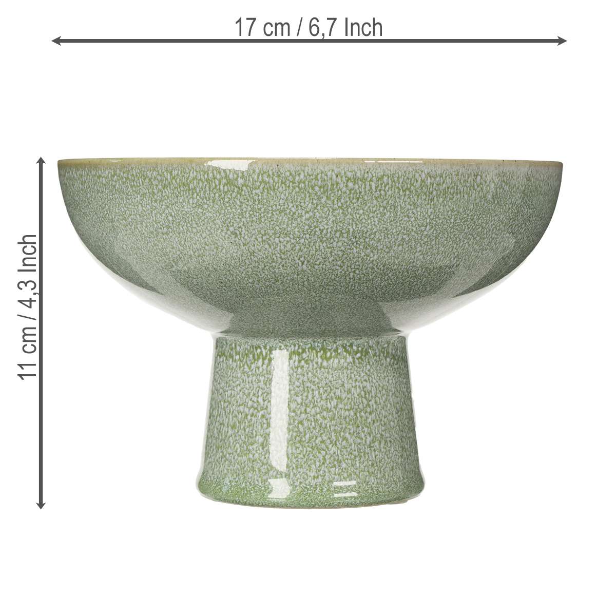 Šis 17 centimetrų skersmens taurė-dubuo, pagamintas iš aukštos kokybės keramikos, yra tobulas estetikos ir funkcionalumo derinys. Patogaus 11 centimetrų aukščio ir 17 centimetrų skersmens, jis stovi ant mažo, bet tvirto pagrindo, kuris suteikia jam dar daugiau patrauklumo. Lygus, žalsvai pilkas paviršius su subtiliu raštu puikiai dera su natūraliomis medžiagomis, tokiomis kaip mediena ar linas, sukurdamas nesenstantį ir modernų vaizdą. Ieškote ypatingo dekoratyvinio dubens savo svetainei? Šis stilingas keraminis dubuo suteikia bet kokiai erdvei lengvumo ir elegancijos. Jis ypač gražiai atrodo ant medinio stalo arba derinamas su šviesios spalvos linu.