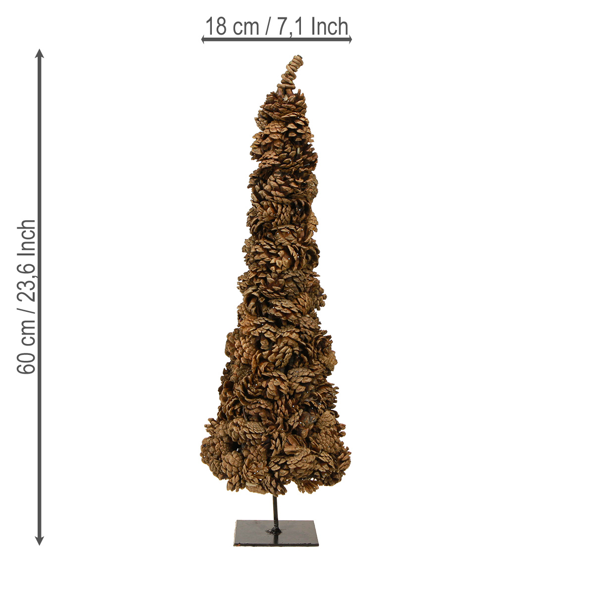 Pagaminta iš aukštos kokybės pušies kankorėžių, medžio ir dailių metalinių bei audinio detalių, ši kankorėžio formos Kalėdų eglutė tikrai patrauks akį. Maždaug 60 cm aukščio ir 16 cm skersmens, ji pakankamai kompaktiška, kad tilptų net mažose erdvėse. Idealiai tinka stalams, indaujoms ir palangėms!