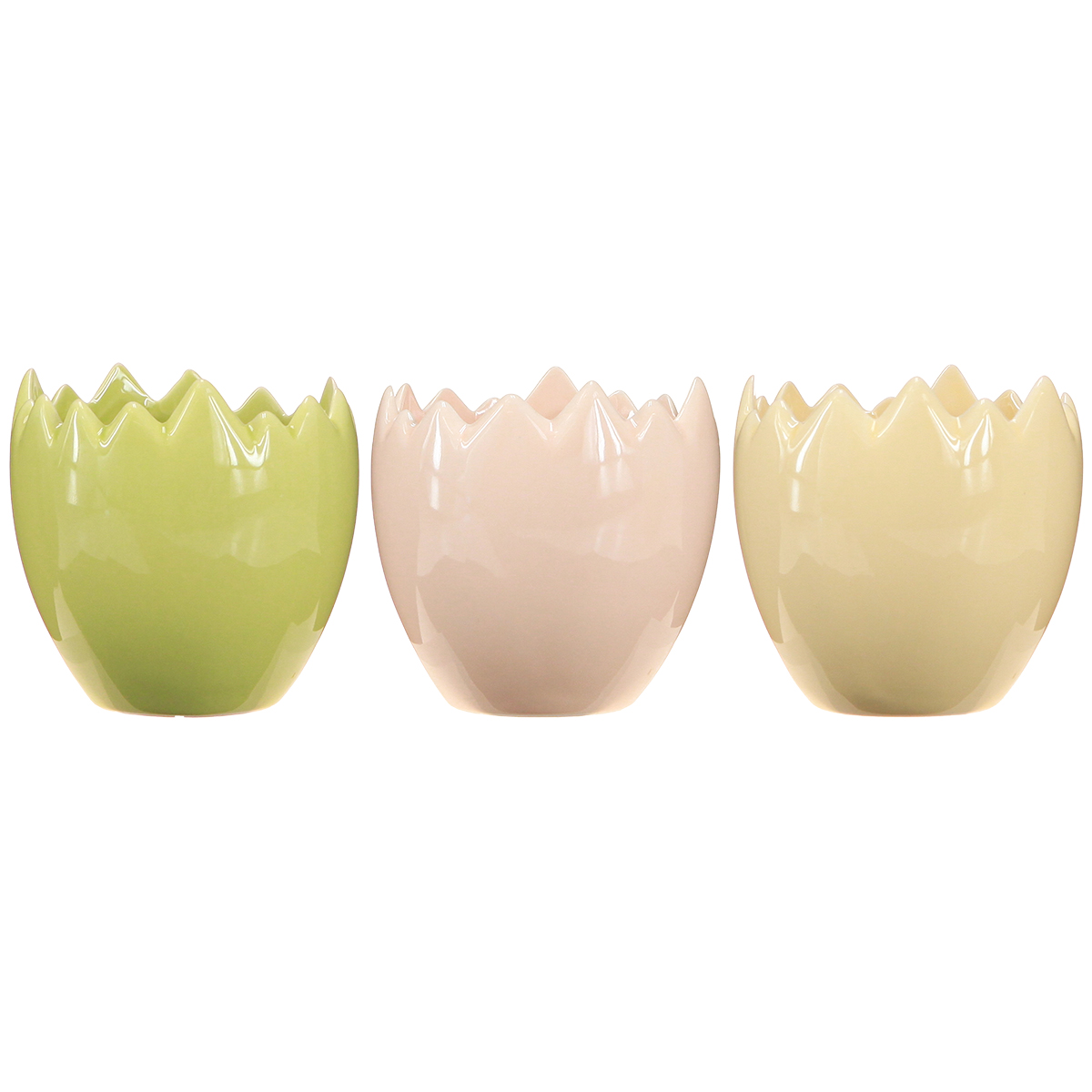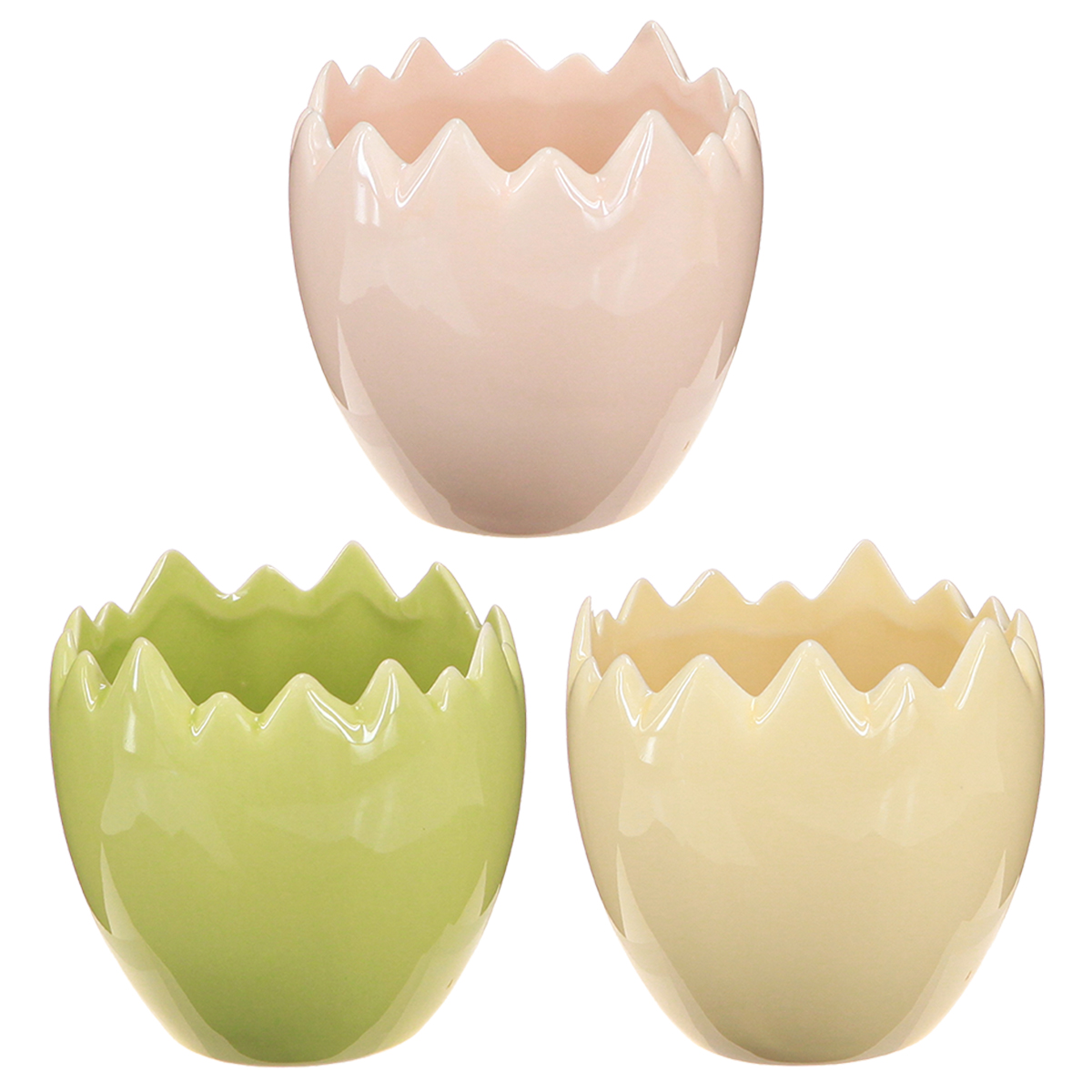 Šie kiaušinio formos gėlių vazonai su subtiliais, sutrūkinėjusiais kraštais kviečia išlaisvinti jūsų kūrybiškumą. Pagaminti iš aukštos kokybės keramikos, jie ne tik maloniai liečia, bet ir žavi savo patvarumu. 9 centimetrų aukščio ir 8 centimetrų skersmens, jie puikiai tinka mažesniems augalams, tokiems kaip sukulentai, žolelės ar pavasarinės gėlės. Švelnūs pasteliniai geltonos, rožinės ir žalios spalvos atspalviai yra subtilūs, tačiau ryškūs – idealiai tinka tokiems interjero dizaino stiliams kaip skandinaviškas, bohemiškas ar modernus-minimalistinis.