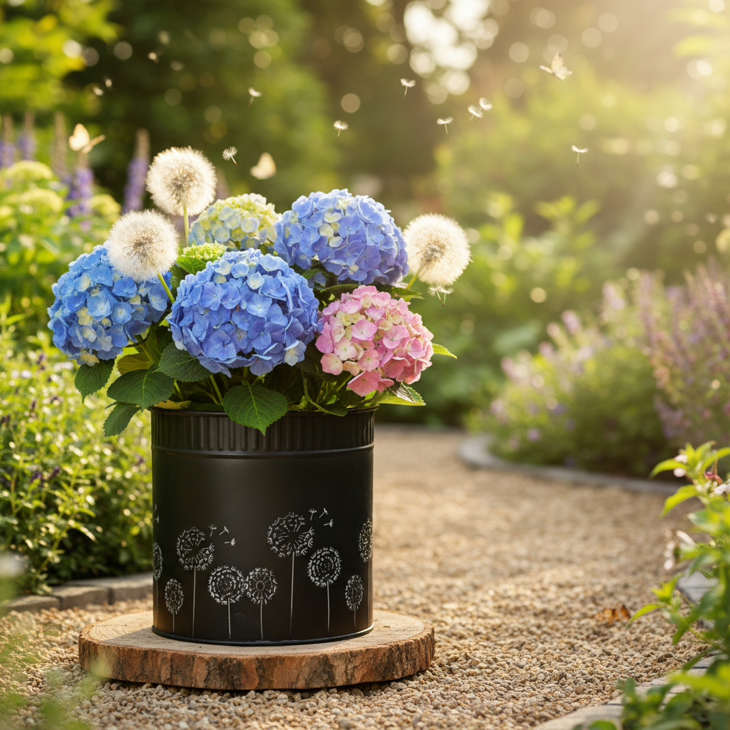 Sėjamoji su kiaulpienėmis suteikia gėlėms ir kompozicijoms originalumo vasaros dekoracijoje. Tačiau juodas gėlių vazonas taip pat gali suteikti ypatingą aplinką mažam žaliam augalui.