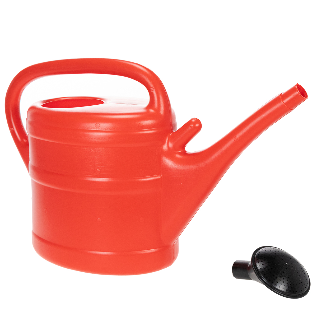 Raudonas laistytuvas pagamintas iš patvaraus plastiko ir tiekiamas su nuimamu snapeliu.