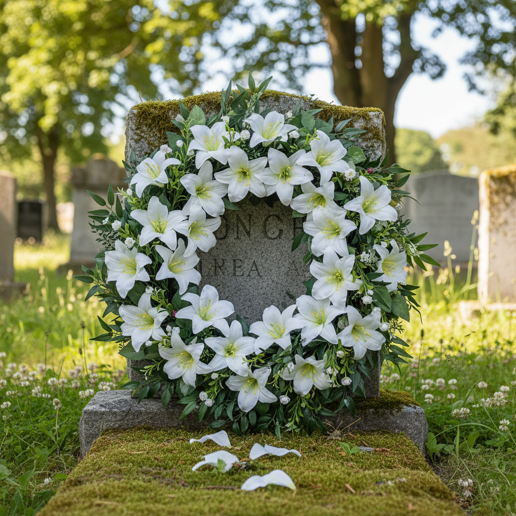 Dėl kokybiško plastiko grakšti gedulo gėlė kompozicijoms yra atspari oro sąlygoms ir lietui. Dekoratyvinės lelijos žiedo galvutė yra ant pintinės vielos, su kuria dirbtinę gėlę puikiai įkomponuosite į memorialinę kompoziciją ar į laidotuvių puokštę. Taigi jūs turite orų ir tinkamą Vėlinių ir Mirusiųjų sekmadienio kapo dekoracijų atnaujinimą.