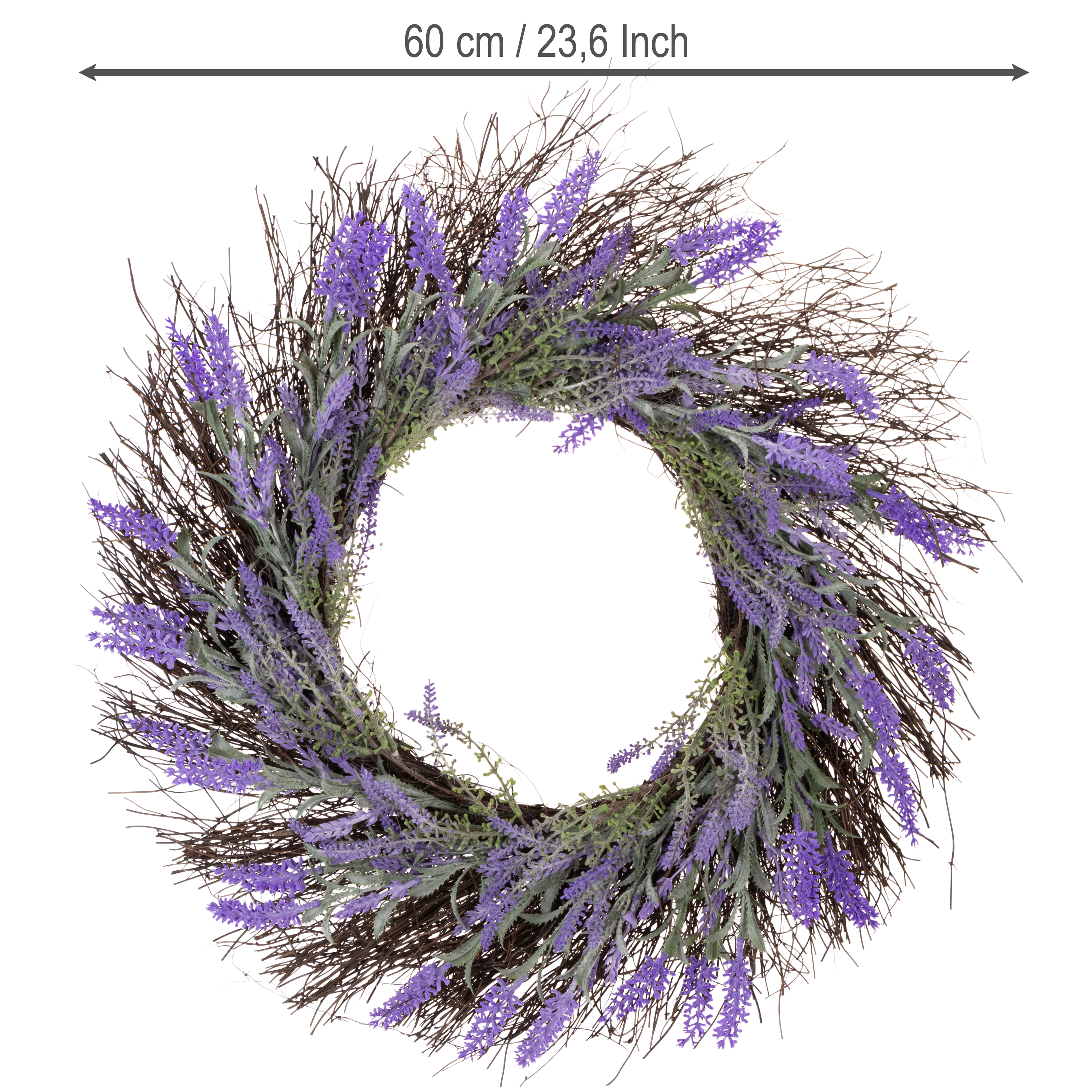 Levandų vainikas spinduliuoja gryna elegancija. Subtilios spalvos ir natūraliai atrodančios vynmedžių šakos paverčia jį universaliu namų aksesuaru. Pavyzdžiui, galite jį naudoti kaip stalo puošmeną su žvakėmis ir šviežiomis gėlėmis arba kaip pavasarinį akcentą savo terasoje. Dėl 60 centimetrų skersmens jis atrodo įspūdingai, kad ir kur būtų padėtas, tačiau išlieka pakankamai neutralus, kad sklandžiai derėtų prie bet kokios aplinkos.