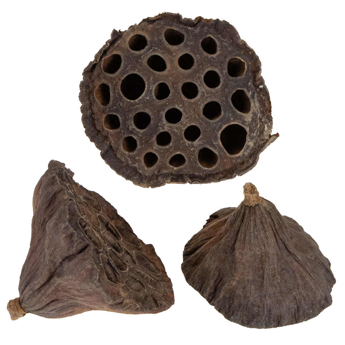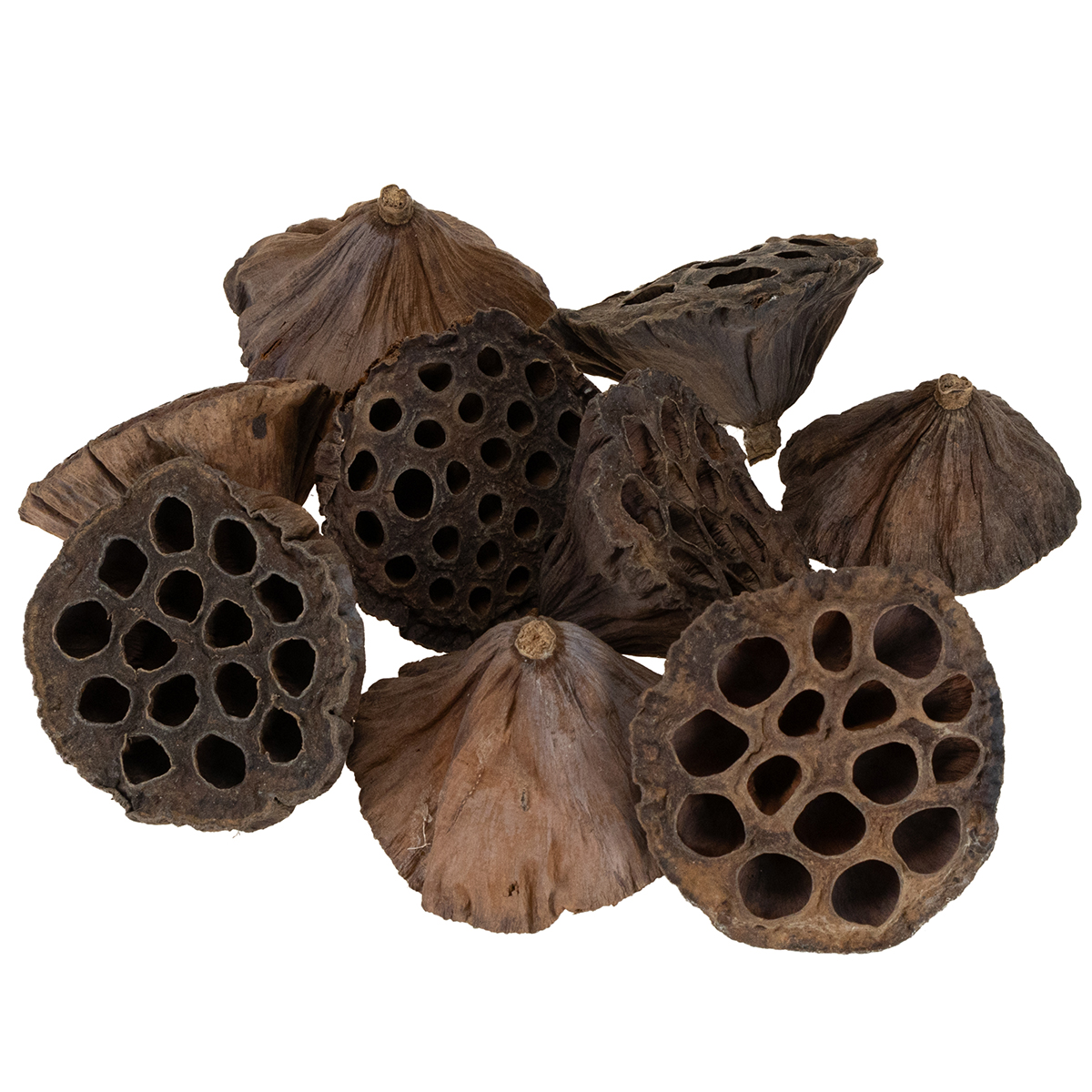 Tamsiai rudi džiovinti vaisiai ypač dera su nespalvotomis ar balintomis egzotiškomis rūšimis, tokiomis kaip kokoso kevalai, nendrių burbuolės, varpelių taurės ir baltymai, taip pat su vietiniais natūraliais produktais, tokiais kaip kūgiai, smailūs megztiniai ir medžių kempinės. Tokius gaminius galite nuostabiai išdėstyti ant puslankiu, pagaminto iš įkišamos medžiagos, ir pridėti stilingų figūrų, simbolių ir gražios gedulo juostelės, kad bendras vaizdas būtų apvalus. Be to, lotoso kapsulės taip pat puikiai dera su natūralia ir gana kaimiška kalėdine puošmena ir, be kita ko, gali būti integruotos į Advento vainiką ar Kalėdų stalo kompoziciją.