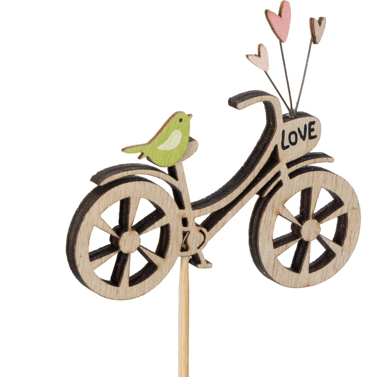 Šie 29,5 cm ilgio mediniai kuoliukai su dviračių motyvais sukuria ryškų, tačiau santūrų akcentą. Subtilūs dviračiai, papuošti mažomis širdelėmis ir dailiais paukščiais, spinduliuoja grynu pavasario džiaugsmu. Natūrali mediena atrodo harmoningai ir dera prie beveik bet kokio interjero stiliaus – skandinaviško, kaimiško ar „shabby chic“. Nuostabus žvilgsnio traukė terasoje, sode ar netgi kaip dekoratyvinis akcentas patalpose.