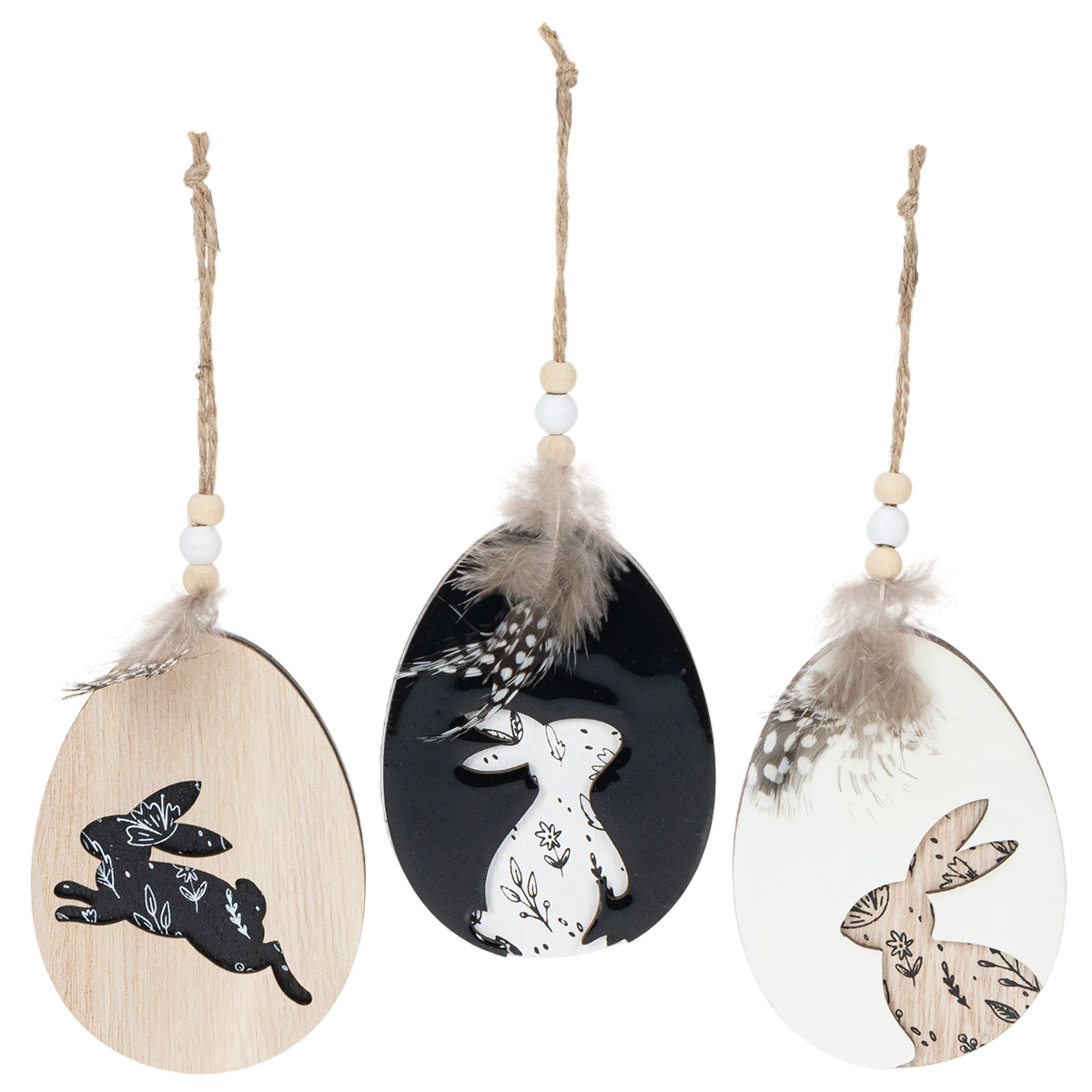 Mediniai Velykiniai kiaušiniai pakabinimui, balti ir juodi, 10 cm, 6 vnt.
