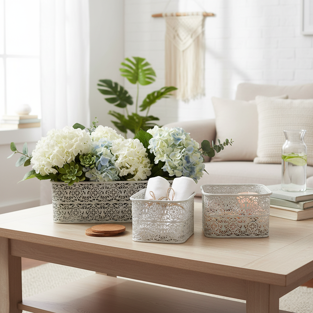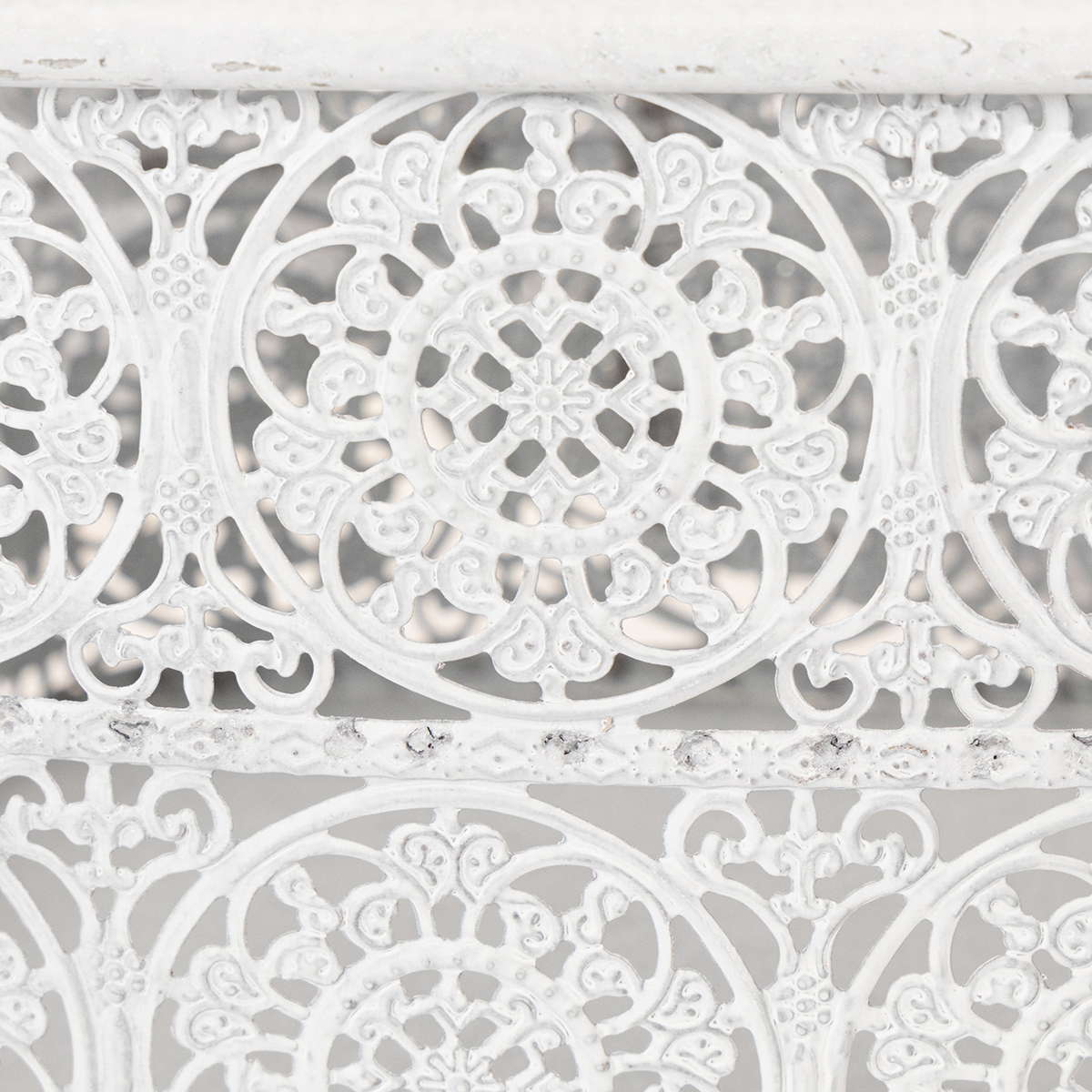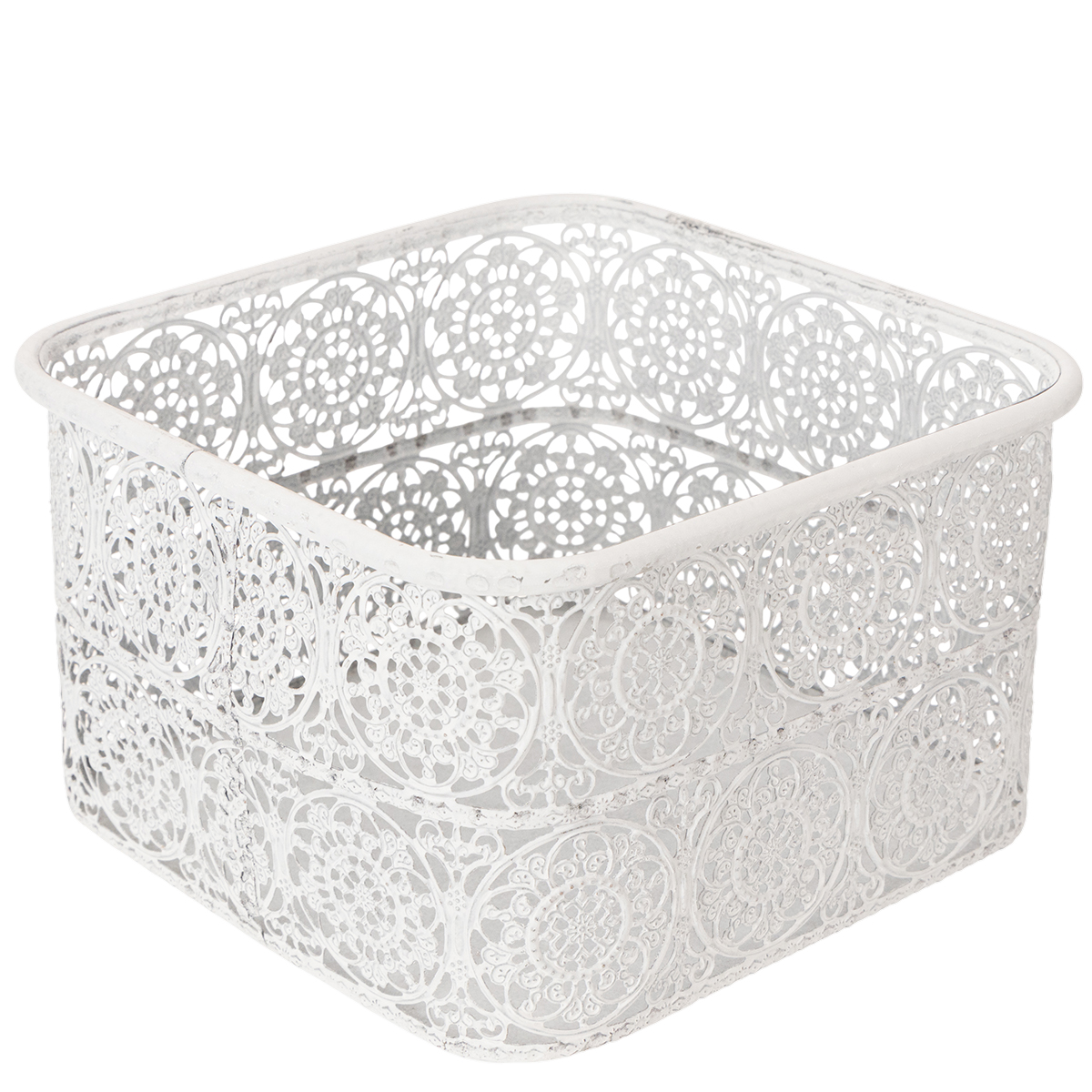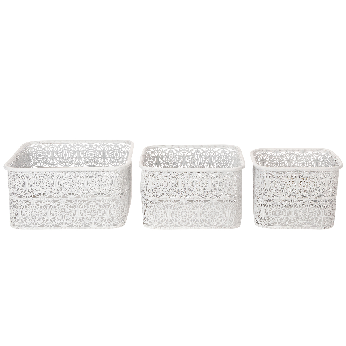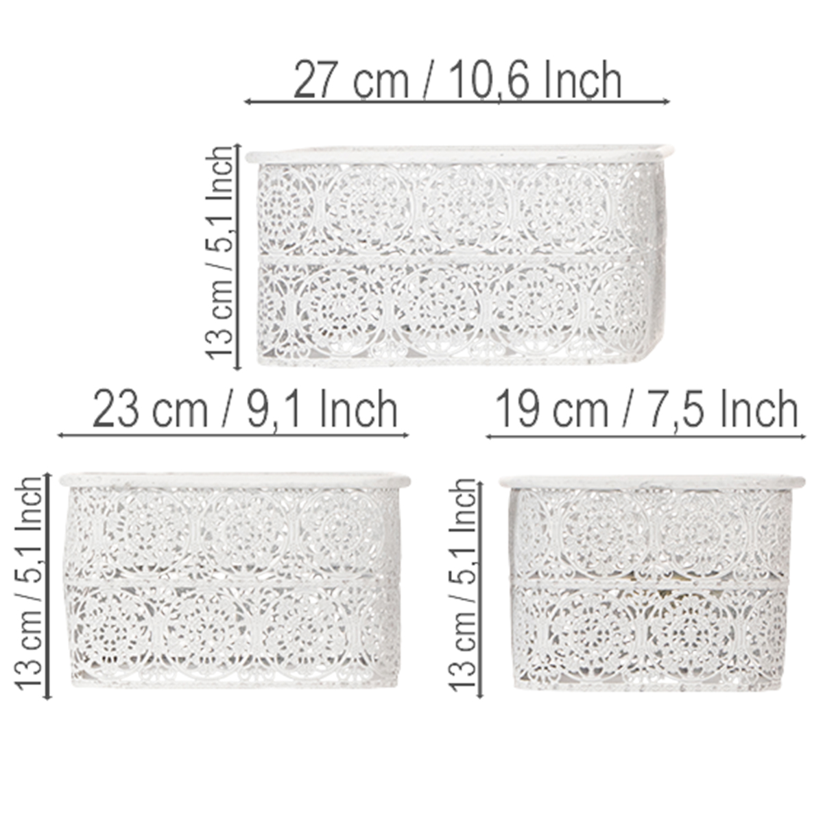 Metaliniai dubenėliai su nėrinių raštu, dekoratyvinis indas, kvadratinis, shabby chic stiliaus, balti, 27/23/19 cm, aukštis 13,5 cm, 3 vnt. rinkinys