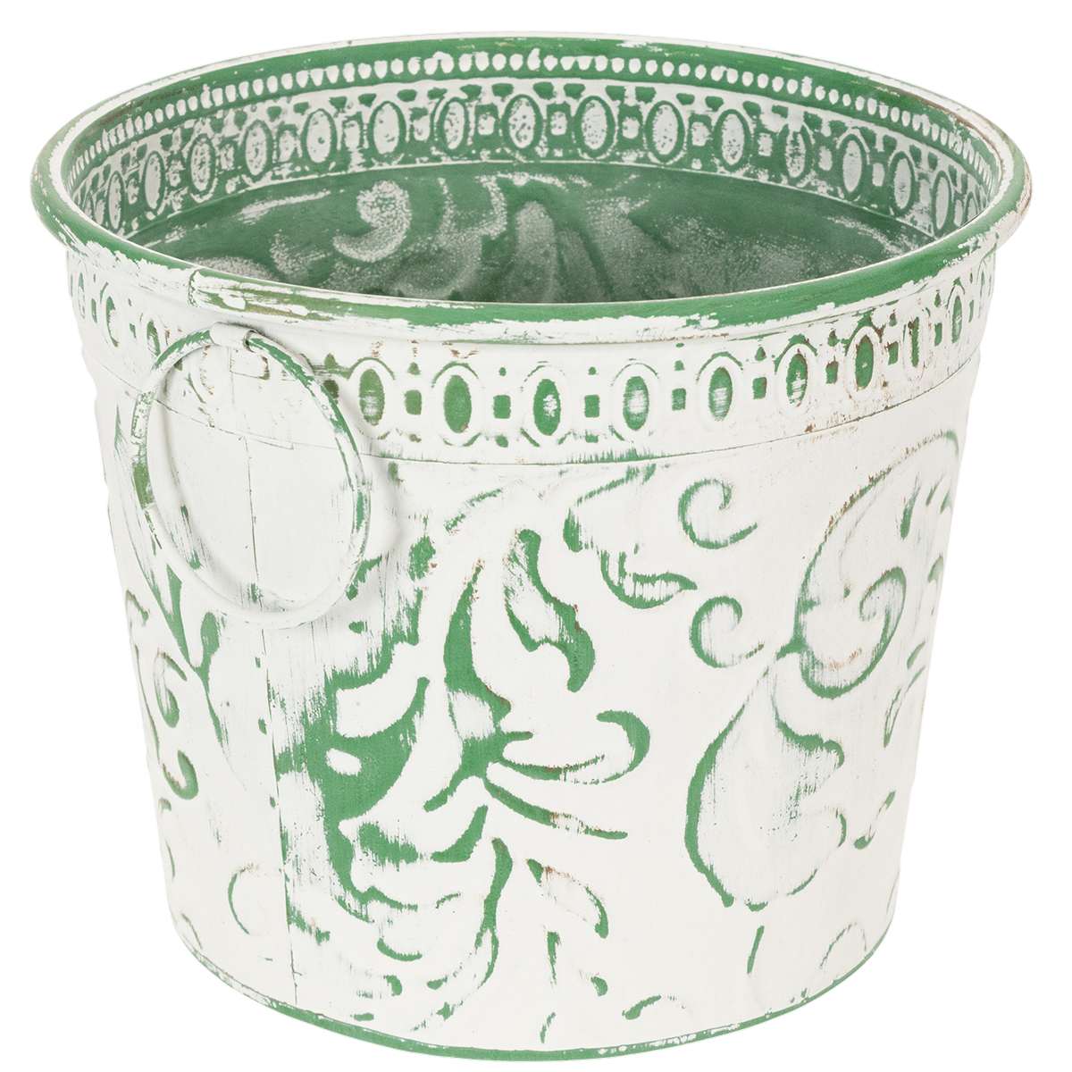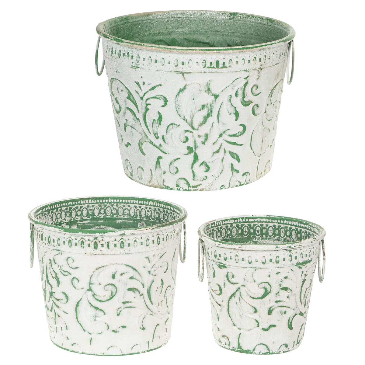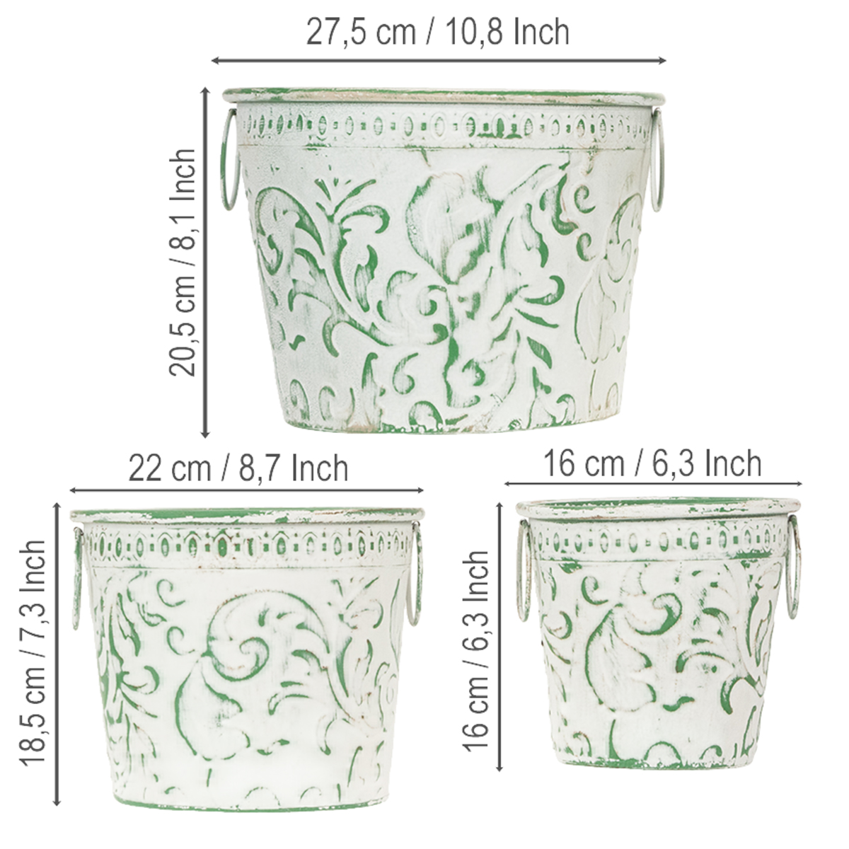 Metaliniai vazonai su rankenėlėmis, vazonai su įspaudu, balti, žali, shabby chic stiliaus, aukštis 20,5/18,5/16 cm, Ø 25,5/20,5/15,5 cm, 3 vnt. rinkinys