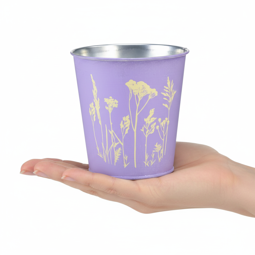 Į metalinę vazoną įdėkite vazoną ir su gėlių vazonu suteikite naujus namus ramunėlėms ir kitoms pievų gėlėms. Metalinis vazonas iš vienos pusės dekoruotas geltonos spalvos gėlių motyvu, todėl levandų spalvos vazono spalva mirksi kaip matinė aukso geltonumo spalva.