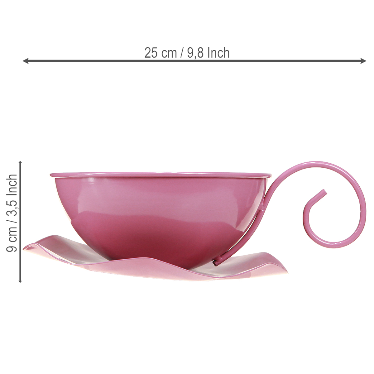Mūsų dekoratyvinis puodelis rožinės spalvos yra tikras akcentas kiekvienuose namuose. Maždaug 16 cm skersmens ir maždaug 9 cm aukščio metalinis puodelis tinka tiek dekoratyviniams, tiek funkciniams tikslams. Pastelinės rožinės spalvos dažytas paviršius patraukia visų dėmesį ir sukuria linksmą, kviečiančią atmosferą. Lenkta rankena ir gėlės formos lėkštė suteikia puodeliui žaismingą, tačiau šiuolaikišką prisilietimą. Dėka puoduko pritvirtinto prie lėkštutės, ši metalinė dekoracija puikiai tinka pristatyti ant šventinio stalo ar ant palangės.