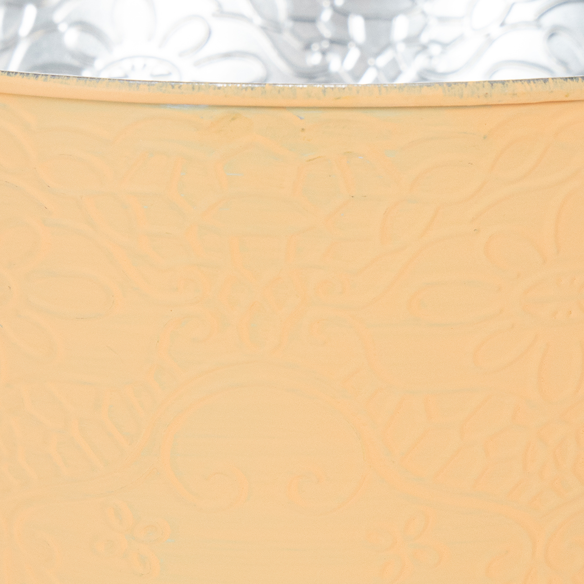 Reljefinės gėlės ir ūseliai suteikia gėlių vazonui puikų vintažinį vaizdą. Išorę džiugina madinga pastelinė oranžinė spalva, padengta matomais teptuko potėpiais.