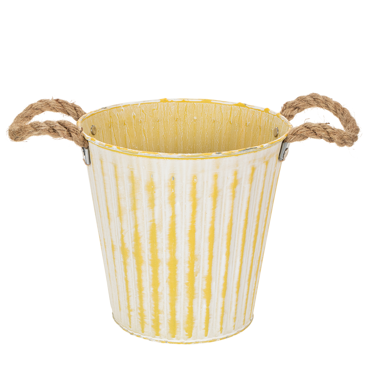 Metalinis vazonas, pavasarinė dekoracija, sodintuvas su rankenėlėmis, geltonos spalvos, shabby chic stiliaus, Ø18cm, aukštis17.5cm