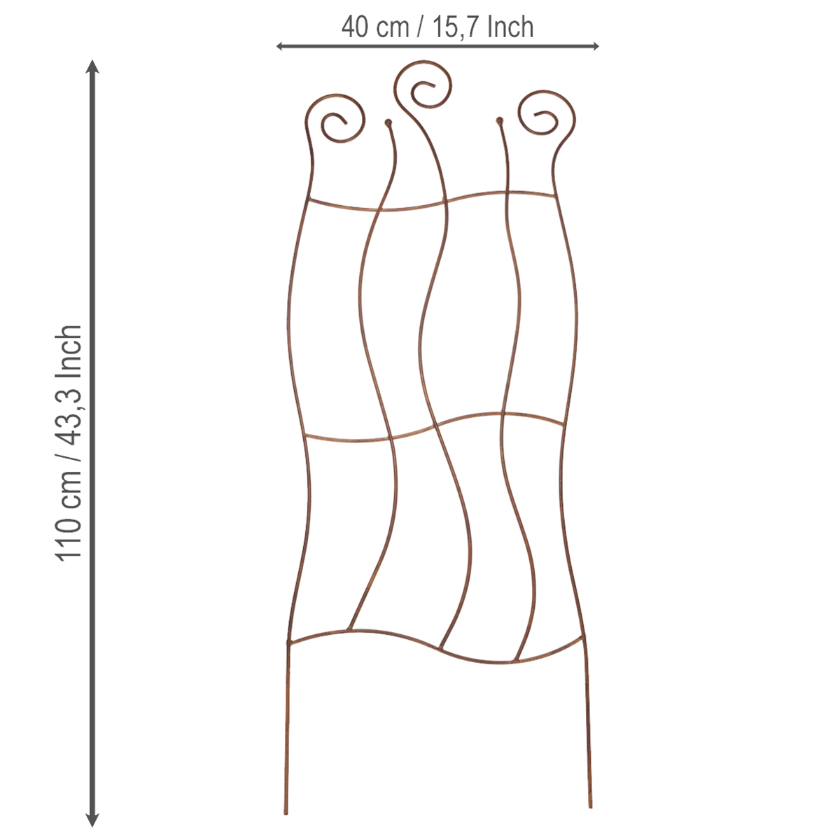 Šios dekoratyvinės metalinės grotelės yra puikus bet kurio sodo papildymas. Dėl savo aptakių linijų jos suteikia elegancijos, kuri puikiai dera prie natūralaus, romantiško ar modernaus sodo dizaino. Dėl tvirtos konstrukcijos grotelės ne tik suteikia stabilią atramą, bet ir yra dekoratyvinis elementas – nesvarbu, ar tai būtų pertvara tarp sodo zonų, ar akį traukiantis akcentas palei takus ir gėlynus. Atsparios oro sąlygoms plieno patina sukuria rafinuotą išvaizdą, kuri puikiai dera su bet kokia aplinka. O svarbiausia: groteles nepaprastai lengva valyti. Drėgnu skudurėliu pašalinsite nešvarumus ir oro sąlygų likučius.