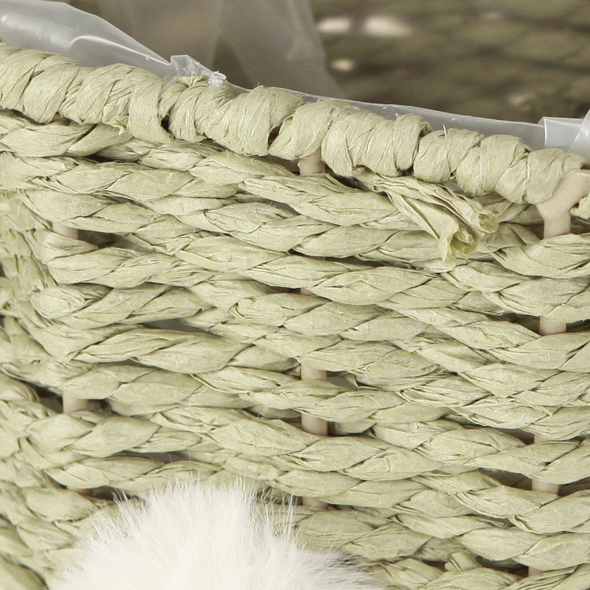 Žalia spalva pabrėžia natūralų medžiagos pojūtį ir puikiai dera su šviežia žaluma, spalvingomis gėlėmis ar velykinėmis dekoracijomis. Integruotas įdėklas leidžia į krepšelį įdėti mažus augalus, tokius kaip raktažolės ar narcizai, jo nepažeidžiant. Jis taip pat idealiai tinka spalvingiems kiaušiniams, skaniems šokoladiniams zuikučiams ar mažoms dovanoms laikyti. Kūrybiškesniam akcentui papuoškite krepšelį lemputėmis, kad sukurtumėte žavingą akcentą patalpose. Jis ypač gražiai atrodo ant indaujų, lentynų arba kaip velykinės dekoracijos pagrindinis elementas.