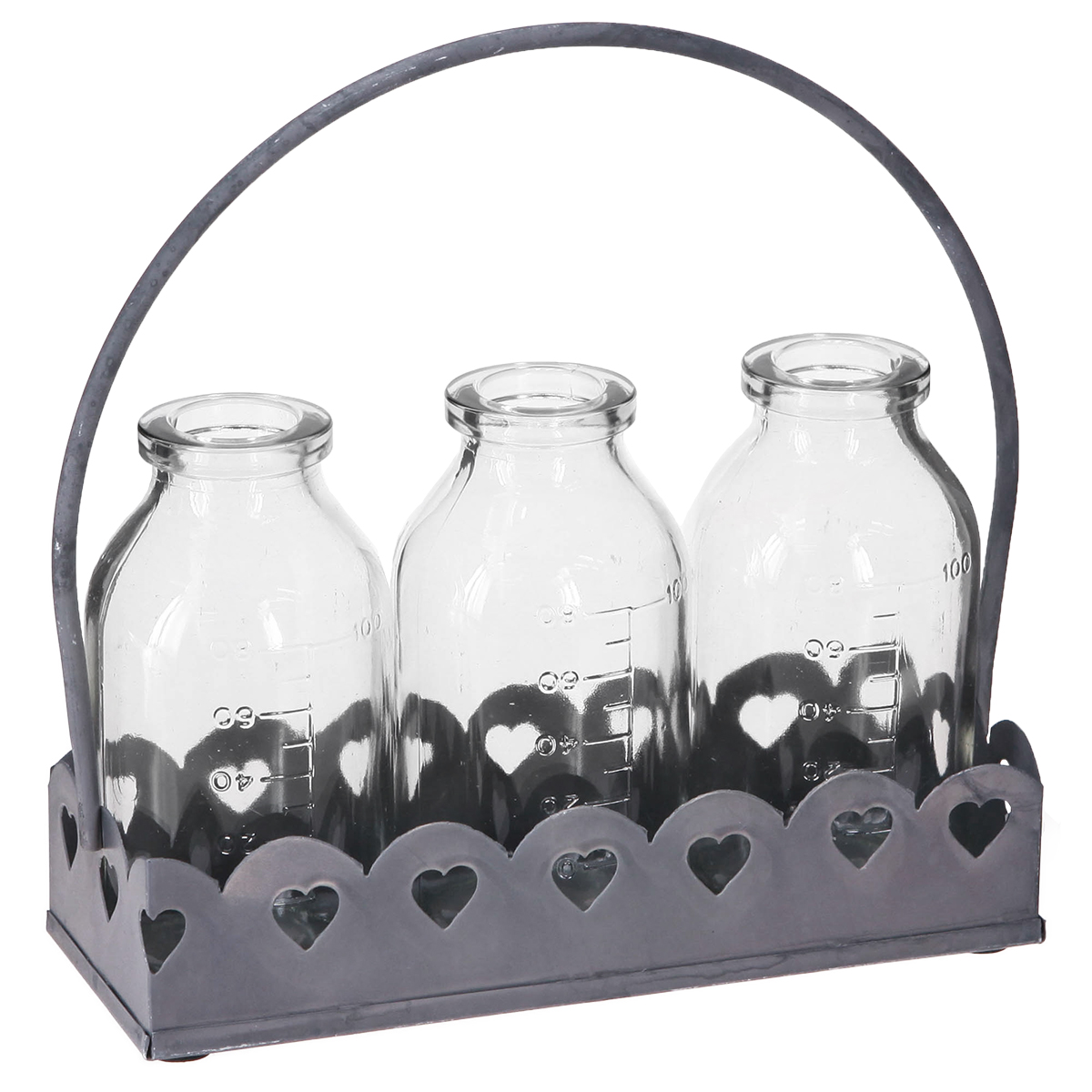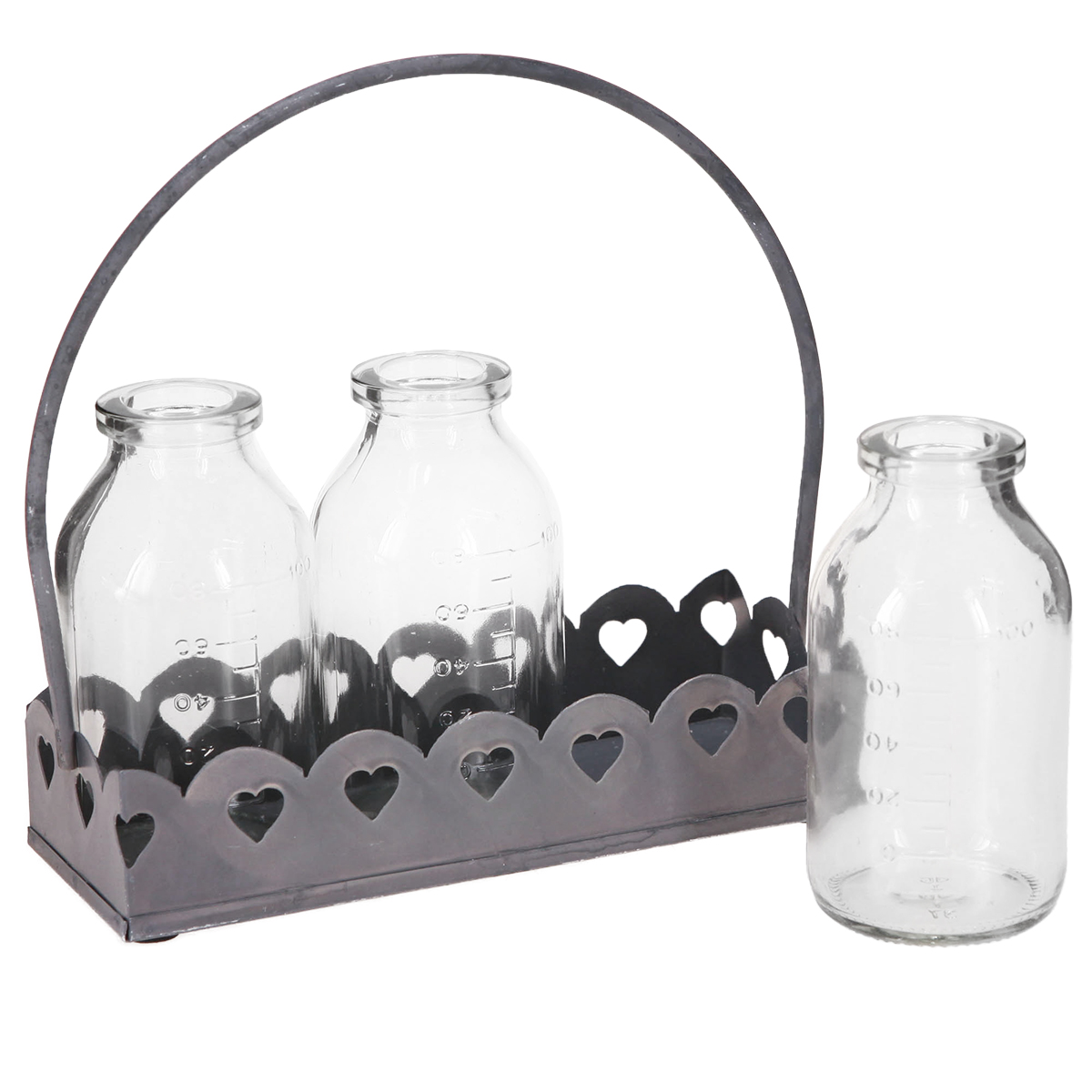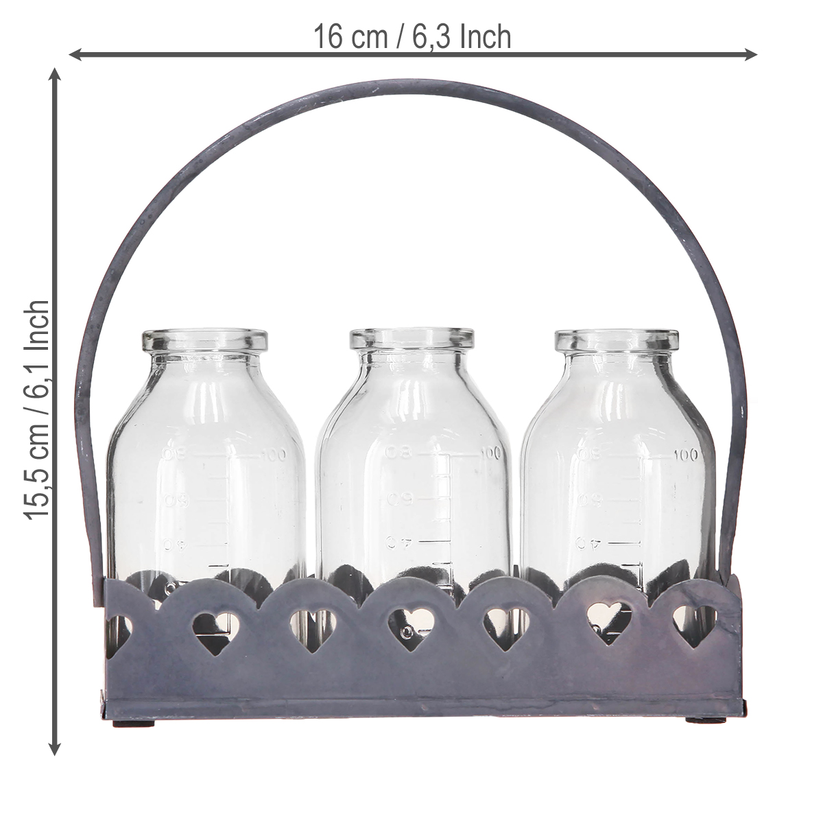 Patirkite stebuklingą mini butelių dekoracijų, kaip vazų ant padėklo, patrauklumą. Šie žavūs dekoratyviniai buteliai puikiai tinka jūsų gyvenamajai erdvei suteikti nostalgijos. Kiekviena iš trijų stiklinių vazų primena senovinius vaistinės buteliukus ir yra pastatyta ant tvirto, pilko metalinio padėklo su išmuštais širdies motyvais. Ši retro stiliaus detalė dekoravimui suteikia romantiškumo, todėl puikiai tinka vestuvių dekoravimui, jaukiam stalo papuošimui ar kaip dovanos idėja. Butelių matmenys suteikia galimybę įvairiai panaudoti – nuo greito mažų gėlių kompozicijų sodinimo iki žolelių ar amatų medžiagų laikymo.