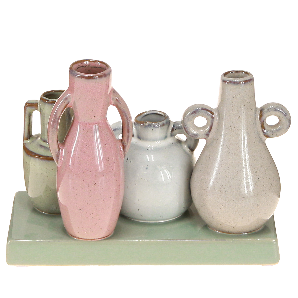 Šis mini keraminių vazų rinkinys susideda iš keturių mažų vazų, išdėstytų ant paprasto žalio padėklo. Kiekviena vaza yra unikalios formos – nuo svogūninės iki lieknos, su dekoratyvinėmis rankenėlėmis arba paprastais linkiais. Ši įvairovė užtikrina, kad rinkinys sukurtų harmoningą vaizdą, išlaikant individualų charakterį. Rožinė, žalia ir balta spalvų gama primena pavasario gaivumą, tačiau nėra pernelyg ryški. Neabejotinas privalumas: aukštos kokybės keramika su lygiu, blizgiu paviršiumi suteikia rinkiniui elegantišką akcentą. Nesvarbu, ar pripildytos šviežių pavasario gėlių, džiovintų šakelių, ar net be gėlių, šios mažos vazos visada traukia akį. Jos puikiai dera prie modernaus minimalistinio ar skandinaviško interjero dizaino koncepcijų. O tiems, kurie mėgsta jaukesnę atmosferą, rinkinį galima naudoti ir kaimišku stiliumi, galbūt derinant su mediniais ar megztais elementais. Tiesiog stulbinantis derinamas su šviesių spalvų padėkliukais ar auksinėmis žvakidėmis. Dėl kompaktiškų matmenų (14 cm ilgio, 7 cm pločio ir 11 cm aukščio) šis rinkinys tinka praktiškai bet kur: ant siaurų indaujų, kaip stalo puošmena valgomajame arba kaip stilingas akcentas lentynose. Tvirta konstrukcija taip pat užtikrina ilgalaikį malonumą. Kiekvienas, ieškantis subtilaus, bet stilingo dekoro, bus sužavėtas.