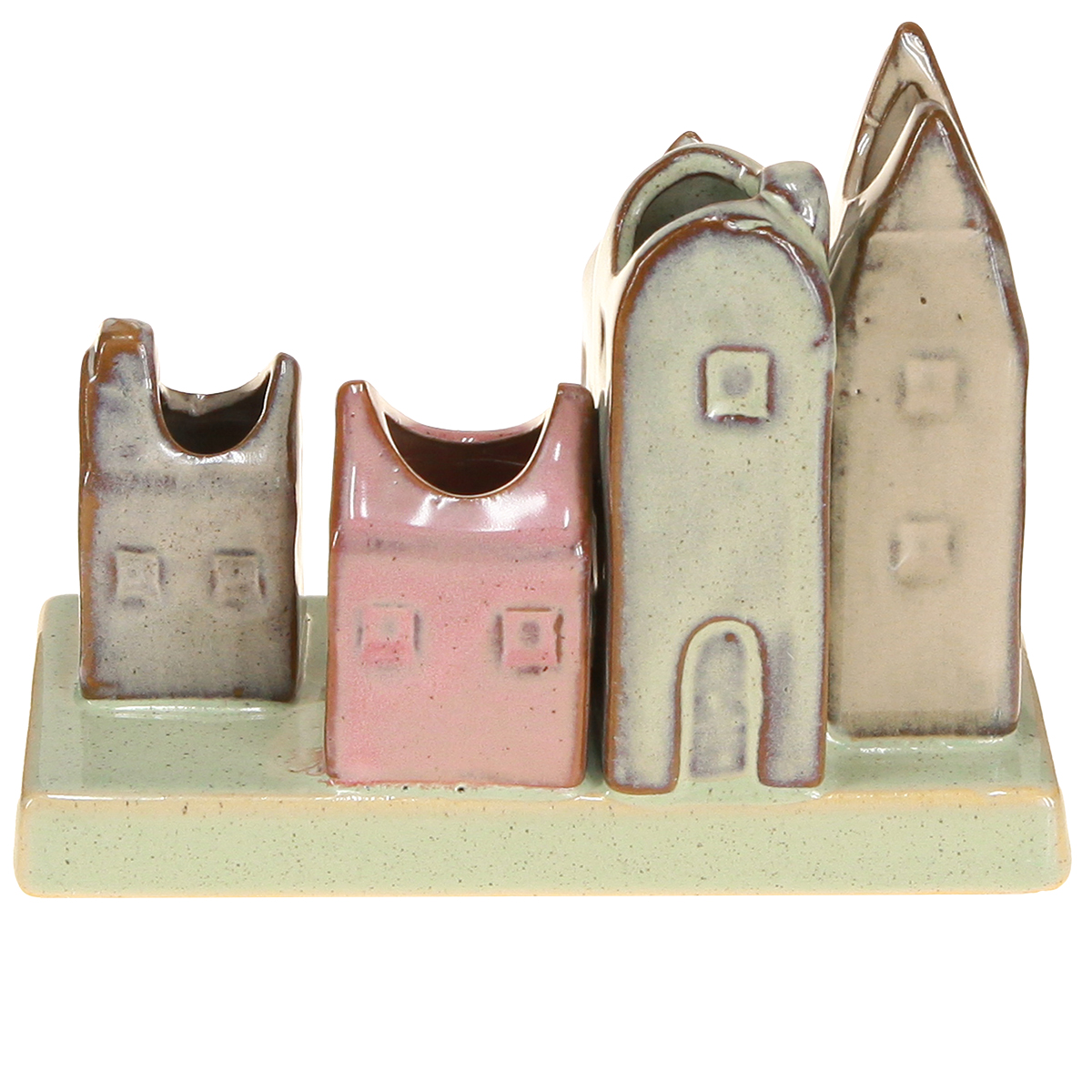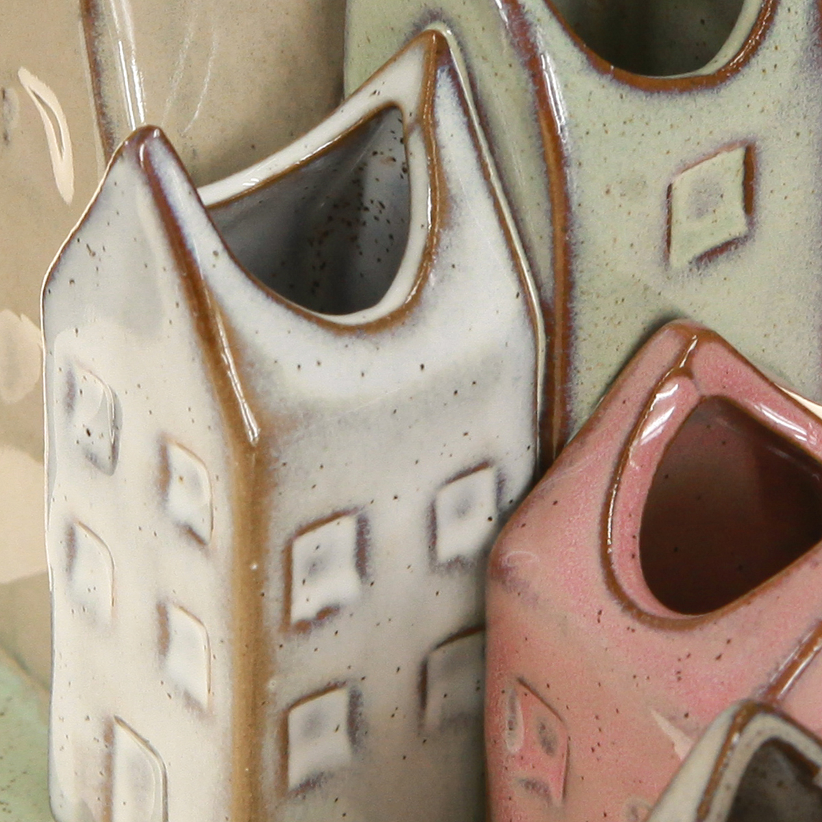 - Penkių mažų vazų rinkinys namelių formos