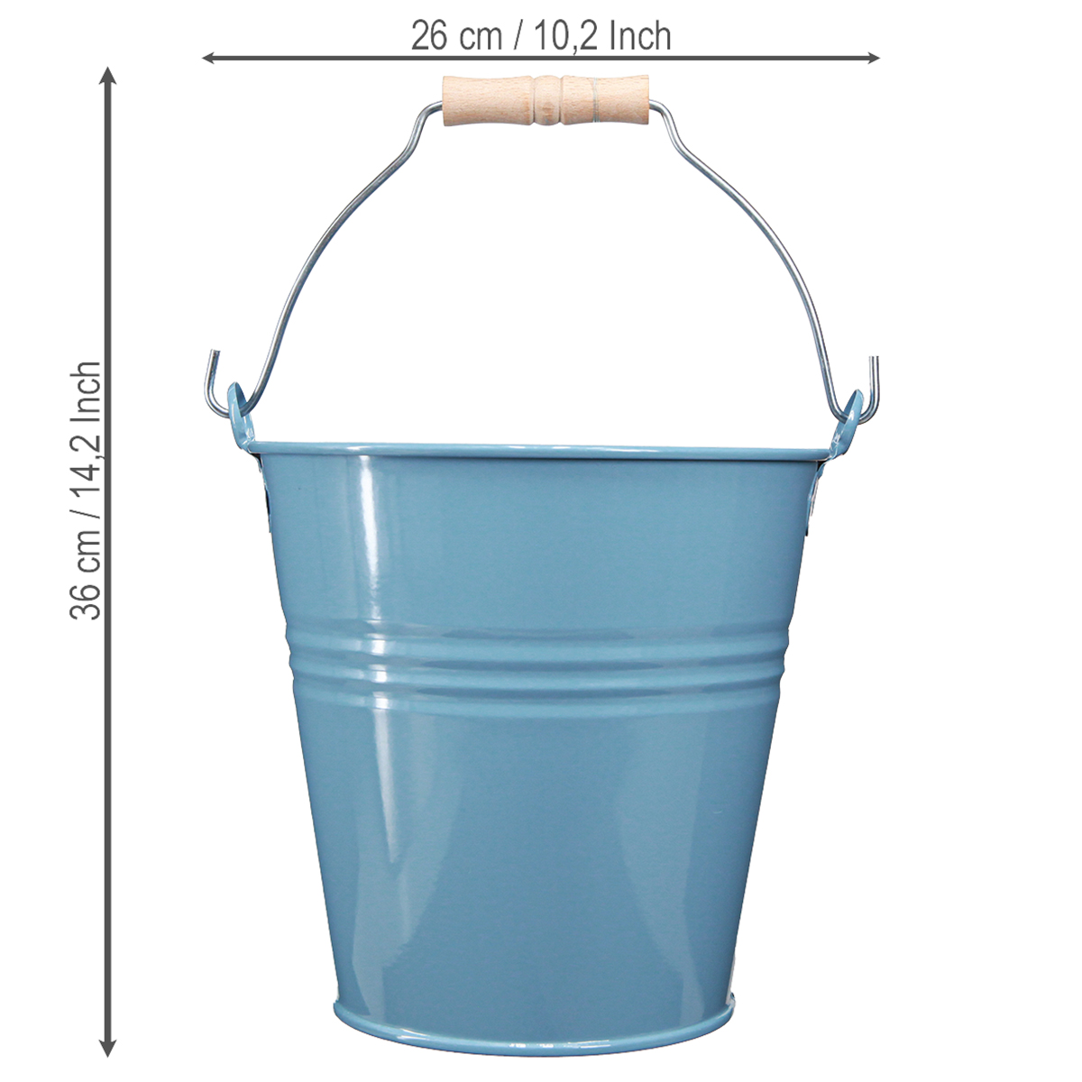 Mėlynas metalinis kibirinis vazonas su medine rankena, 26x22,5x23 cm
