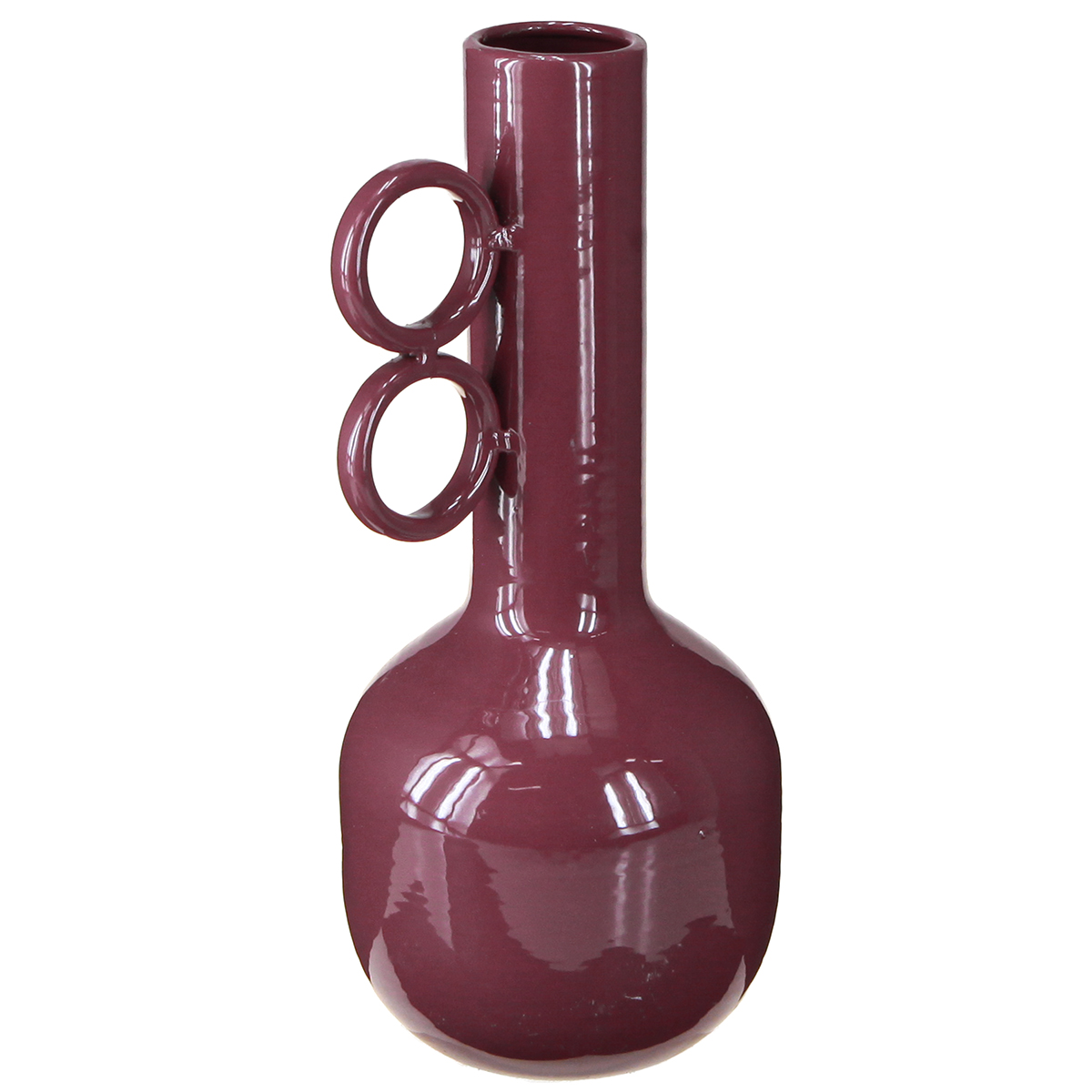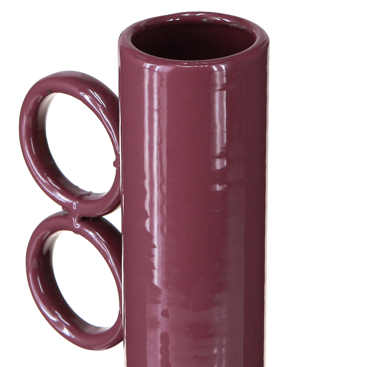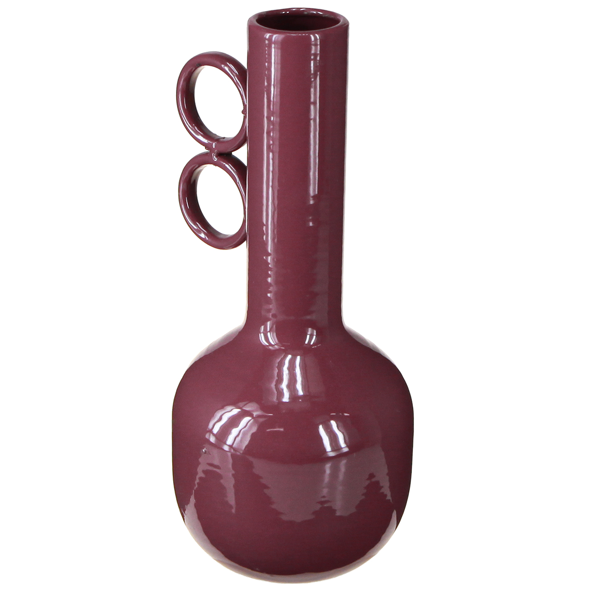 Ši vaza žavi savo rafinuotu formos ir funkcijos deriniu. Plonas, ilgas kaklelis suteikia jai tam tikro grakštumo ir idealiai tinka stilingai eksponuoti ilgakočius žiedus. Apvalios rankenos – tikras akį traukiantis akcentas – yra ne tik dekoratyvios, bet ir pabrėžia šiuolaikišką šio kūrinio charakterį. Pagaminta iš tvirto metalo, vaza išsiskiria ne tik vizualiai, bet ir savo patvarumu. Blizgi raudona apdaila suteikia jai prabangos pojūtį ir paverčia ją ryškiu bet kurio kambario akcentu.