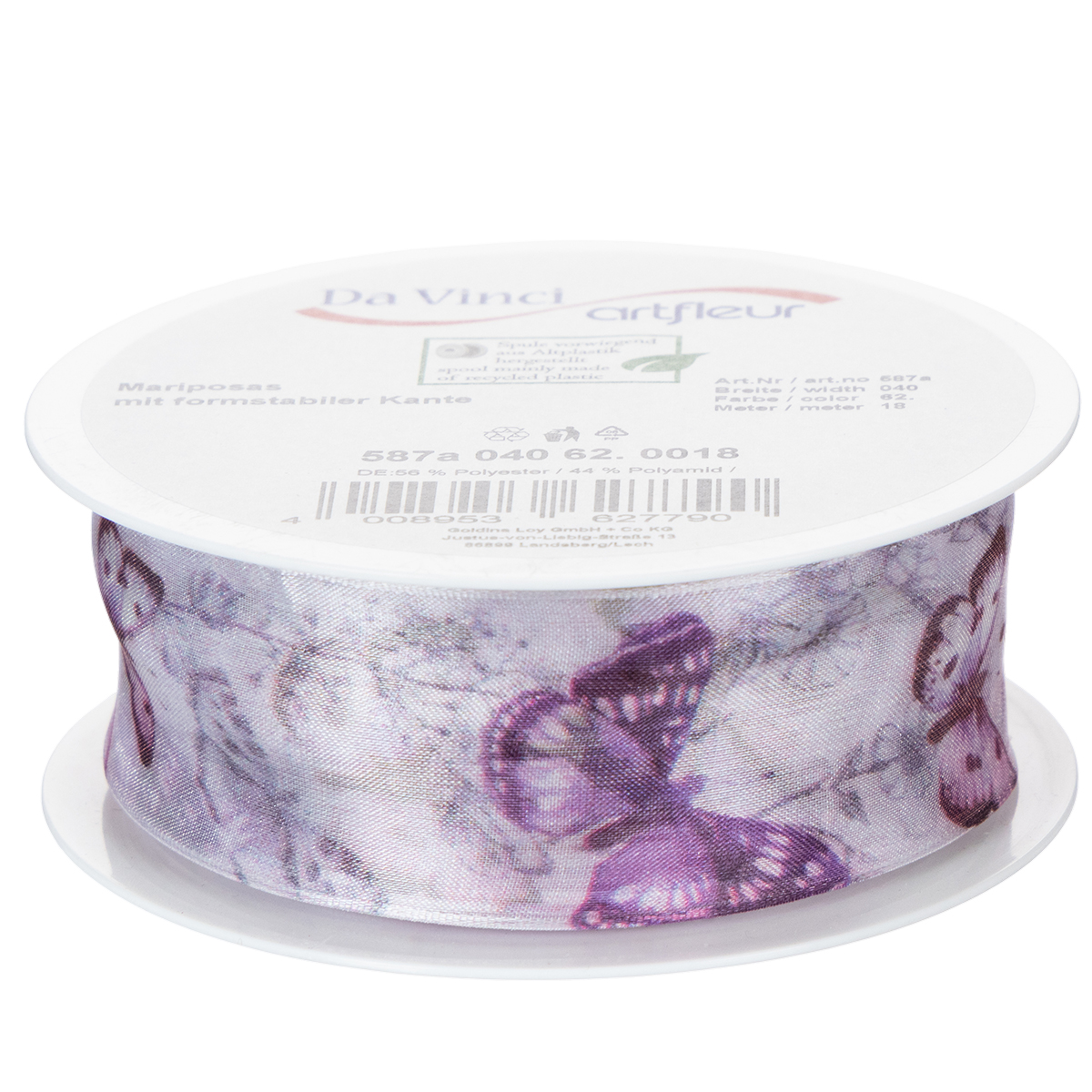 Produkto pavadinimas: Organzos juostelė, šifono juostelė, drugeliai, violetinė, 40 mm, 18 m