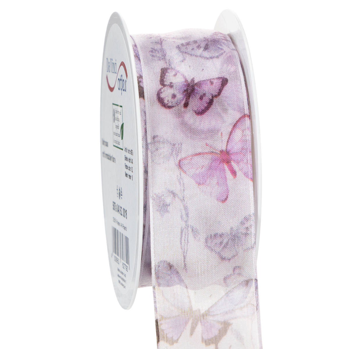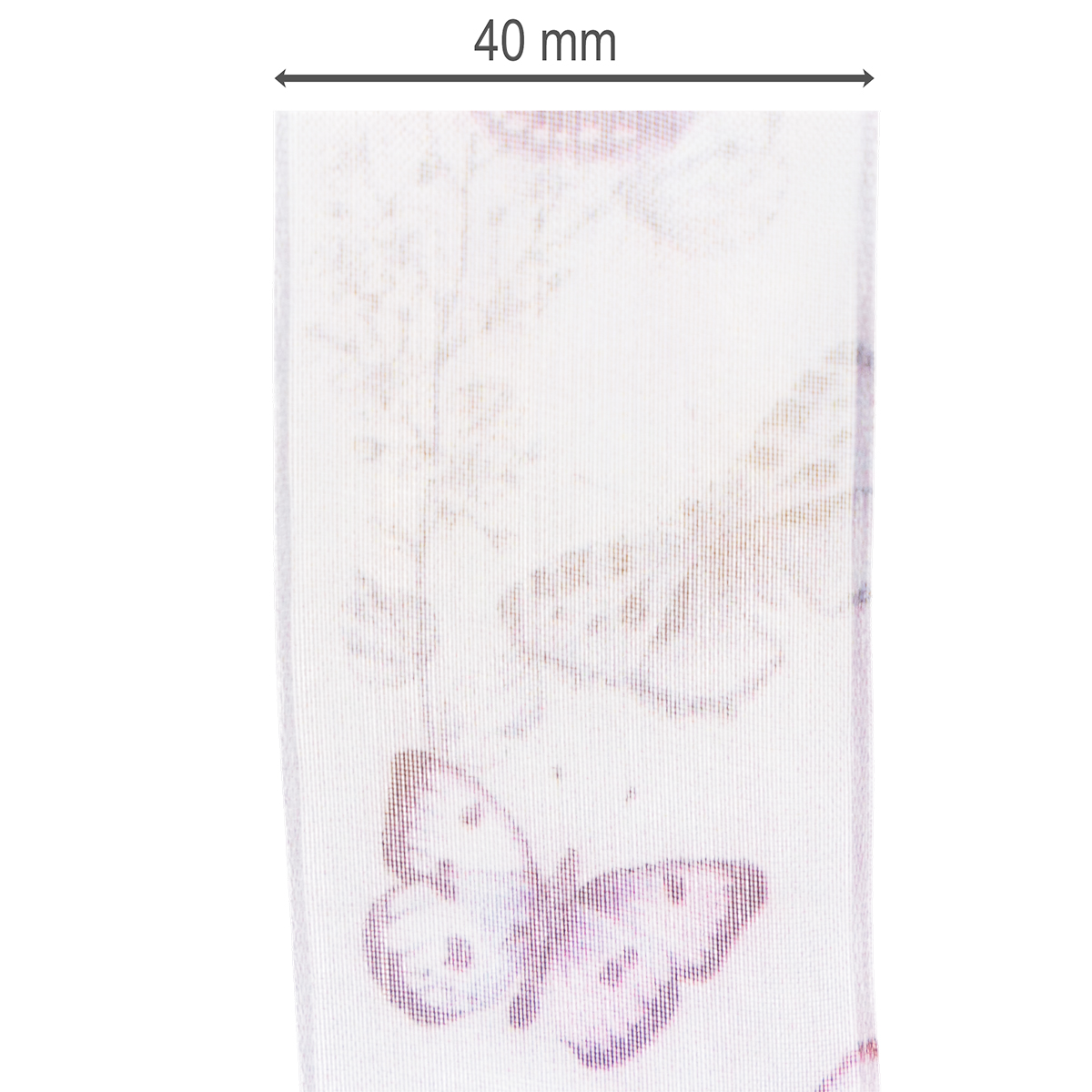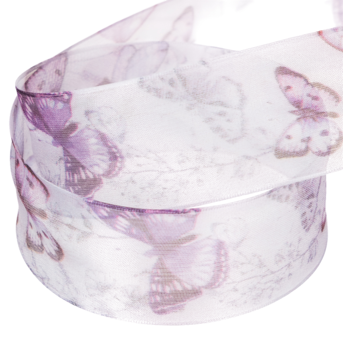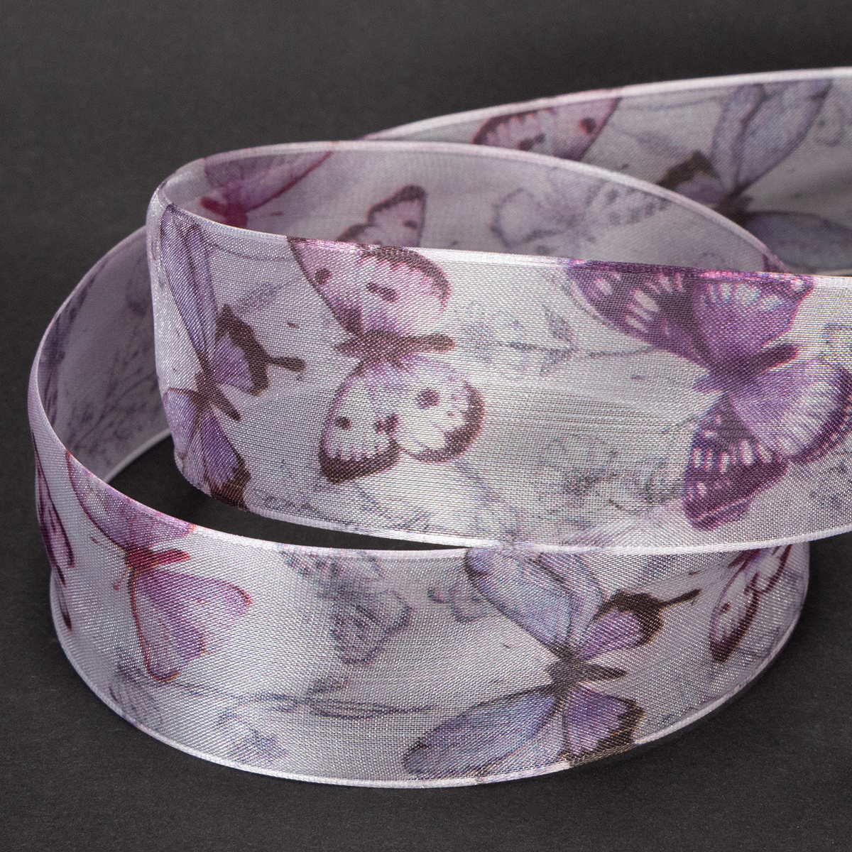 Organzos juostelė, šifono juostelė, drugeliai, violetinė, 40 mm, 18 m