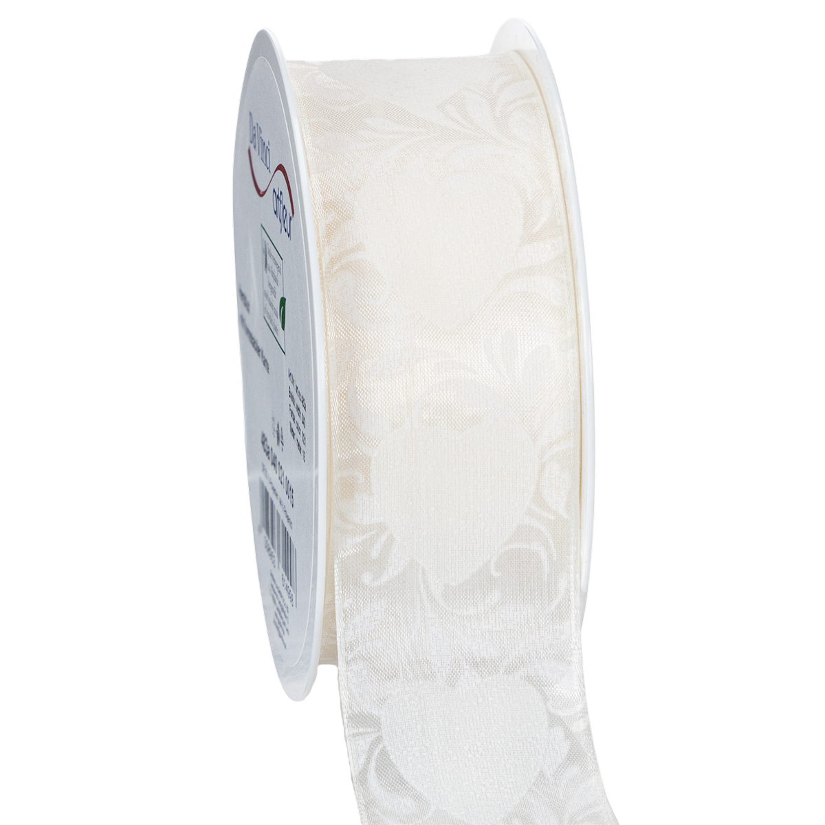 Organzos juostelė, kreminės spalvos, dekoratyvinė juostelė su širdelėmis, 40 mm pločio, 15 m ilgio
