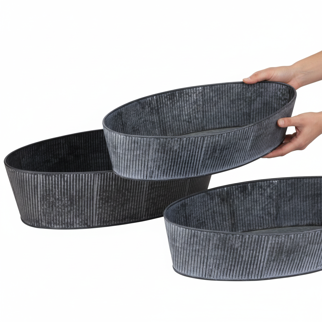 Ovalus dubuo, pagamintas iš metalo ir juodos spalvos, sujungia stilingą eleganciją su žavia vintažine estetika, kuri pagerins jūsų namus. Nesvarbu, ar tai akį traukiantis dekoratyvinis dubuo, nostalgiška stalo puošmena ar kaimiškas gėlių dubuo – šis dviejų vienas ant kito sudedamų metalinių dubenėlių rinkinys atveria daugybę kūrybinių galimybių. Elegantiška juodos, skalbtos pilkos spalvų gama, taip pat smulkus griovelių dizainas puikiai dera prie bet kokio skurdo prašmatnaus ar industrinio stiliaus interjero. Naudokite dubenėlius kaip augalų dubenėlius ir pridėkite žalią spalvą kambariniais augalais ar žolelėmis. Mažesnis puikiai tinka stilingam raktų laikymui arba sukulentams.