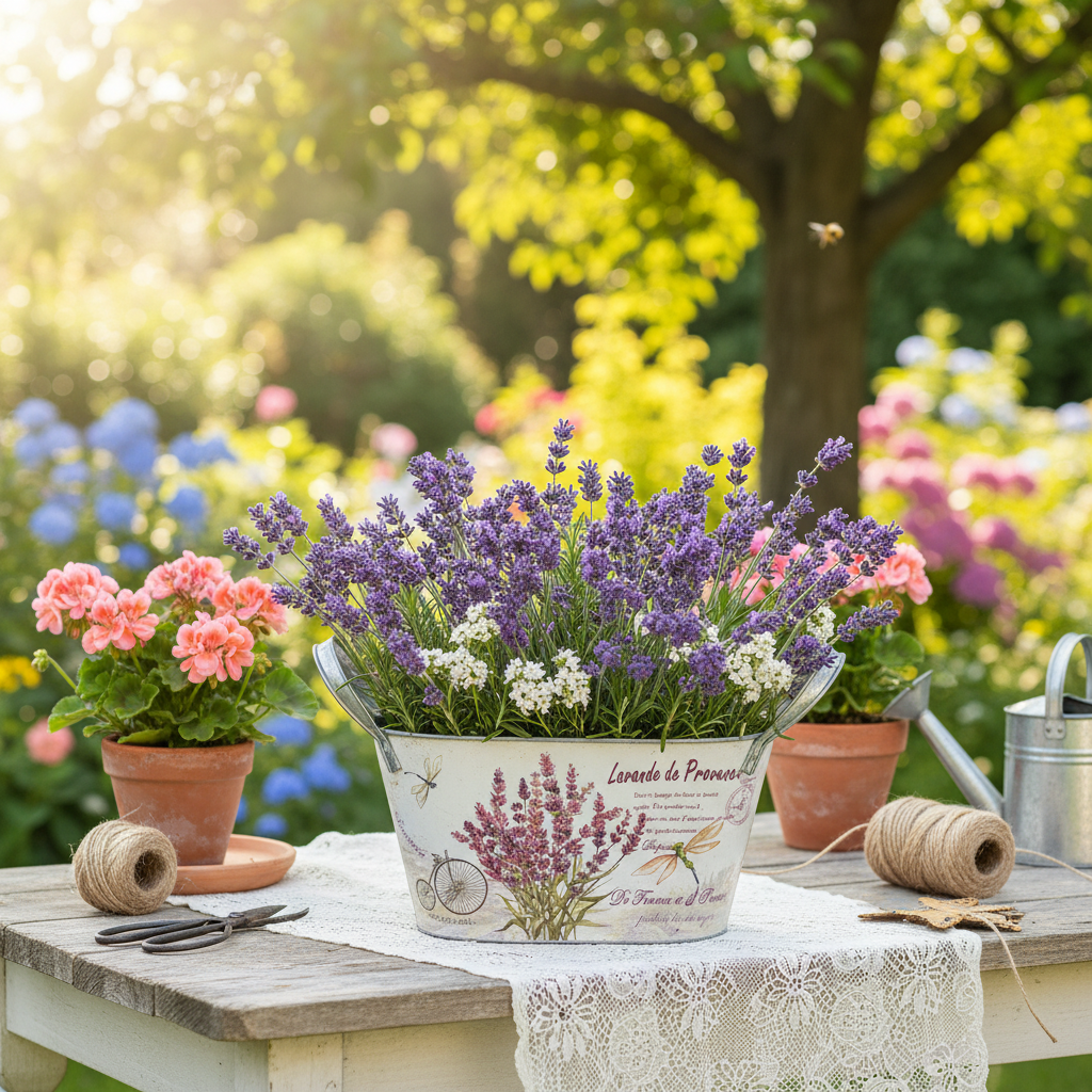 Gėlių dubenyje sukurkite vasarišką levandų kompoziciją arba apvyniokite vazoną folija, kad galėtumėte pasodinti metalinę dekoraciją.